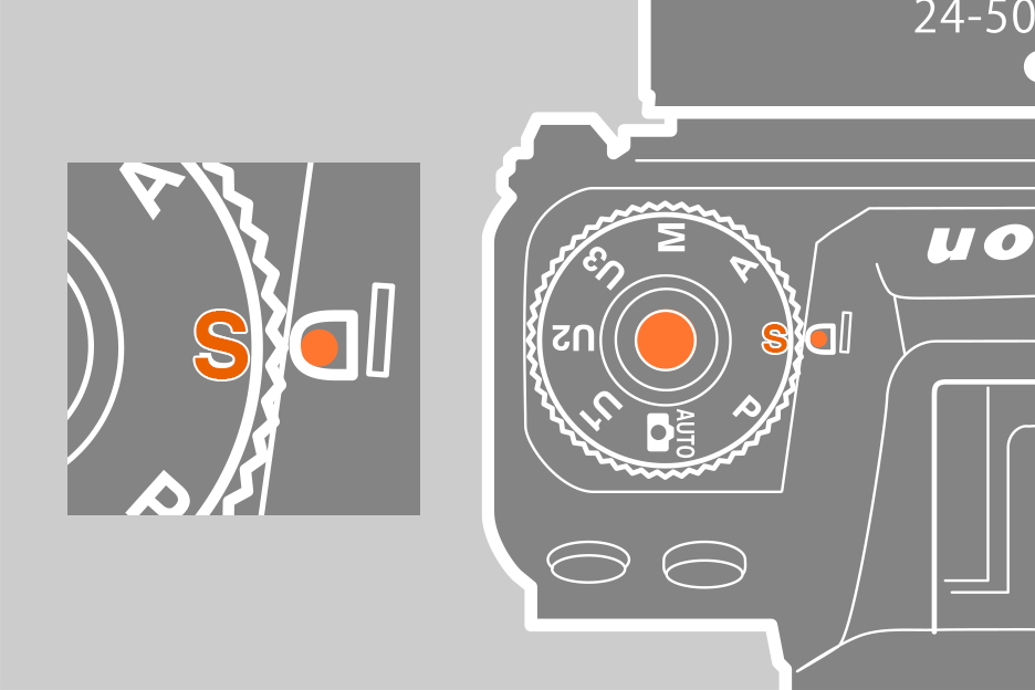 撮影モードを[S シャッター優先オート]に設定するには、撮影モードダイヤルロックボタンを押しながら撮影モードダイヤルを[S]に合わせます