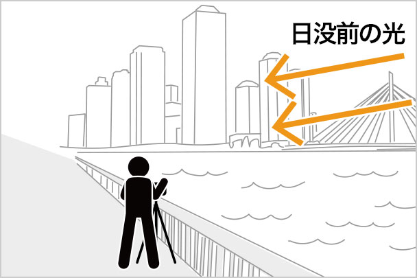 都心にある大きな川の遊歩道から、対岸にそびえるマンションをメインに川の風景を切り取りました。撮影したのは2月。冬は空気が澄んで空がきれいに抜けるため、夕焼けになる直前の美しい空の色を繊細に捉えることができました。スローシャッターでの撮影のため、三脚を使いました。