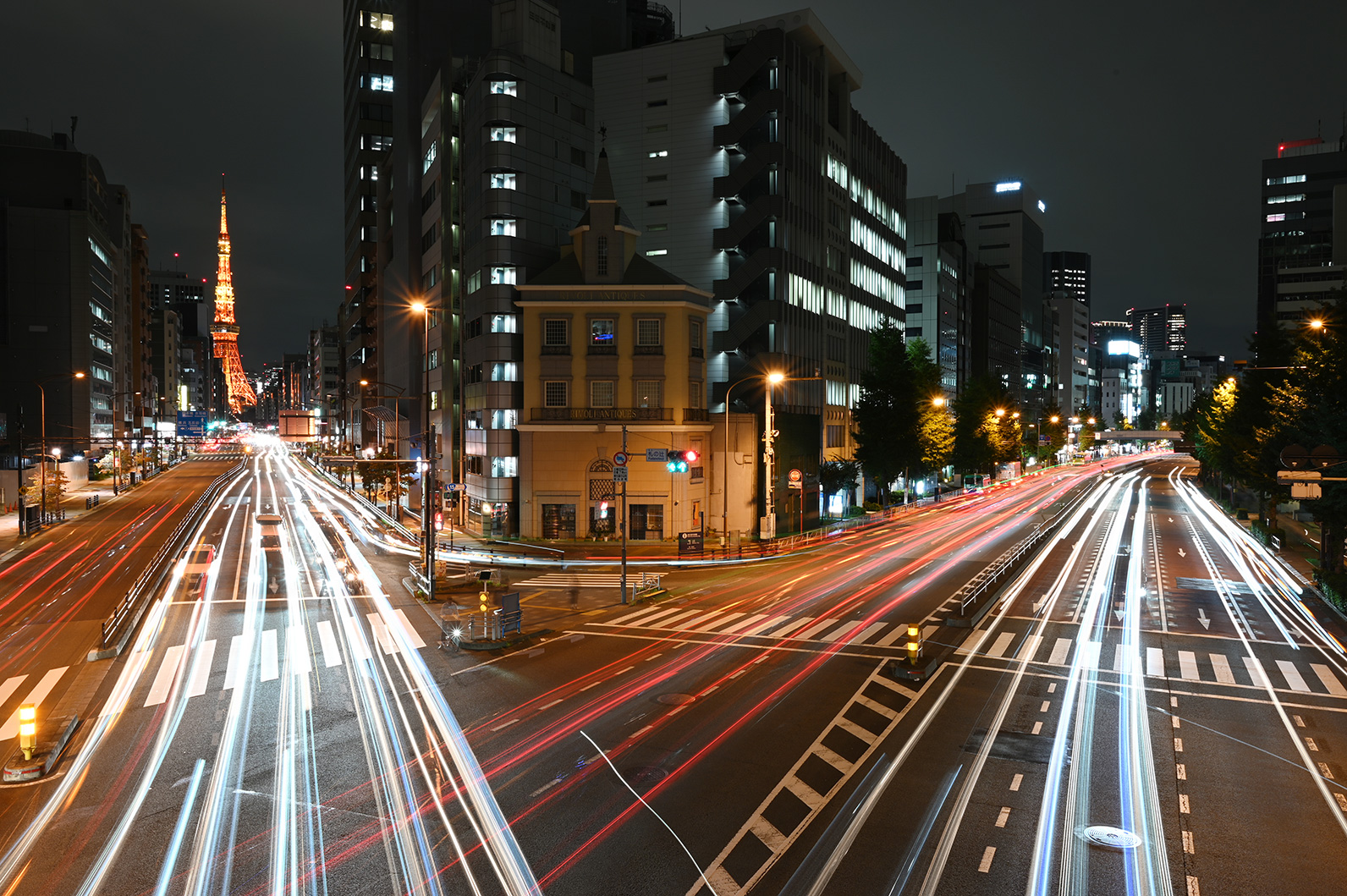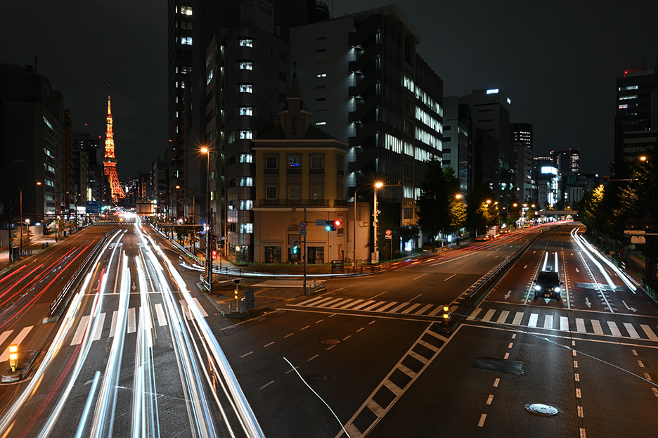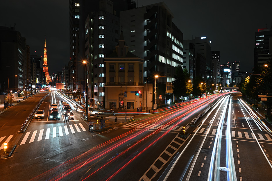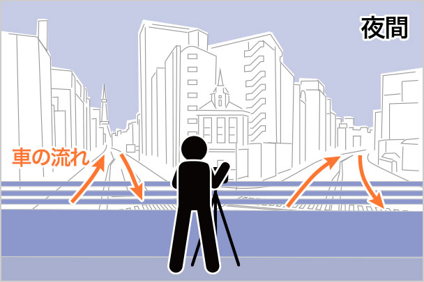 交差点にある歩道橋の上から、通りの様子全体を写す広角画角で撮影しました。三脚を使っての撮影となるため通行者の邪魔にならないよう、またあまり長時間の撮影にならないよう配慮しましょう。また三脚を使ったスローシャッター撮影の場合、手ブレ補正機能がかえってブレを引き起こすことがあるため、設定をオフにしましょう。