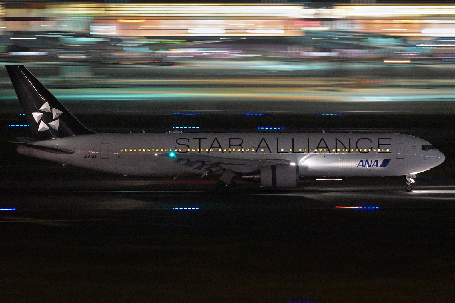 夜、空港の滑走路に着陸してきた飛行機。スローシャッターで、飛行機の動きに合わせてカメラを振りながらシャッターを切る「流し撮り」で撮影を行っています。カメラの動きに合わせたことで、飛行機は止まっているように写り、背景にあるターミナルビルや誘導灯の明かりは光の帯のように流れています。動いている飛行機の動感を表現することで、スピードが強調された1枚です。