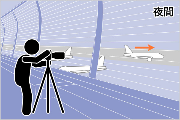空港にある展望デッキから、上下のブレを抑えつつカメラを左右に振ことができるビデオ用の三脚を使い撮影しました。展望デッキには安全のためのワイヤーフェンスが張られていますが、ワイヤーフェンスの写り込みをなるべく避けながら、飛行機が下りてくる位置や流して写す背景の場所を確認して構図を決めます。フェンスにレンズを近づけ、望遠の焦点距離でワイヤーフェンスをボカしながら撮影しましょう。