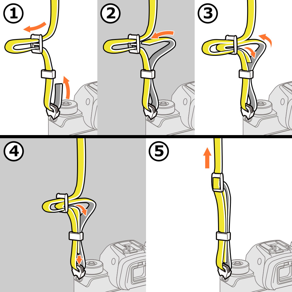ニコン巻き:ストラップの先端を内側にしまう巻きかたですので見た目もスッキリとして邪魔にならず、ストラップが緩む心配もありません
