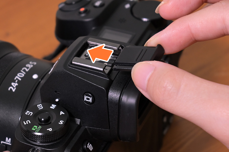 取り外しかた:カメラをしっかりと支えながら、アクセサリーシュー全体を親指で押さえカメラ背面側にスライドさせます