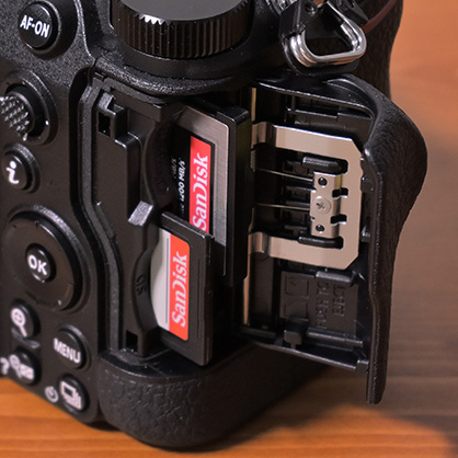 撮影に必要不可欠なものといえば、「メモリーカード」です。メモリーカードはXQDカード、CFexpressカード、SDカードなど書き込み速度や容量の違うさまざまな種類のものがあります。カメラごとに使用できるメモリーカードが異なり、1種類だけでなく2種類使用できるものもあります。必ず、対応したものを使用しましょう。