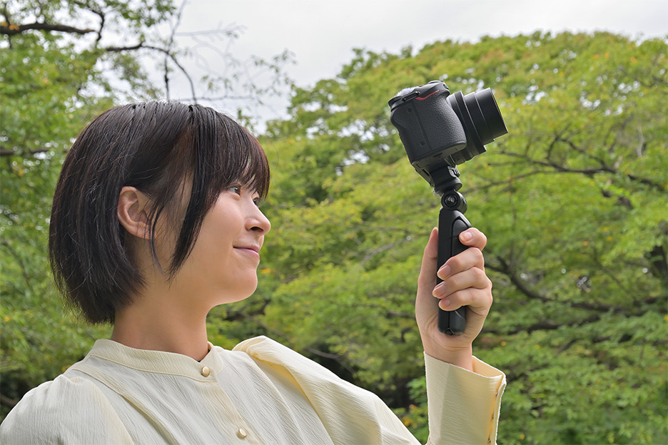 「トライポッドグリップ」とはさまざまなアングルでの撮影を可能にしてくれる、より手軽な動画・静止画撮影を後押ししてくれるカメラアクセサリーです。グリップを手で持ちながら撮れば、自撮りやバリアングル撮影も無理なくフレーミングでき、グリップ部分にリモコンも装着できるため片手でカメラの操作も可能です。