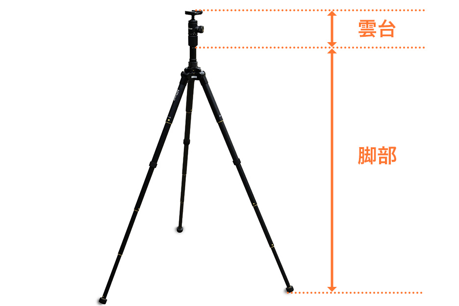 三脚は、3本の脚で自立させる「脚部」とカメラを装着する「雲台」に分かれています。