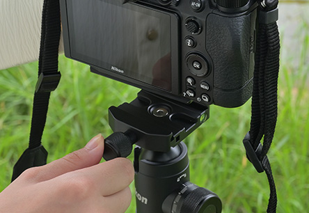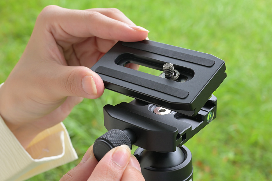 プレート部分をカメラ台に装着します(プレートの装着方法は三脚ごとに違いますので、使用説明書をご確認ください)。しっかり固定しましょう。