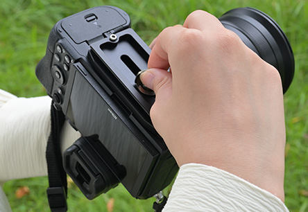クイックシュー方式の場合、まずプレートをカメラに装着します。