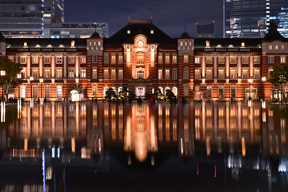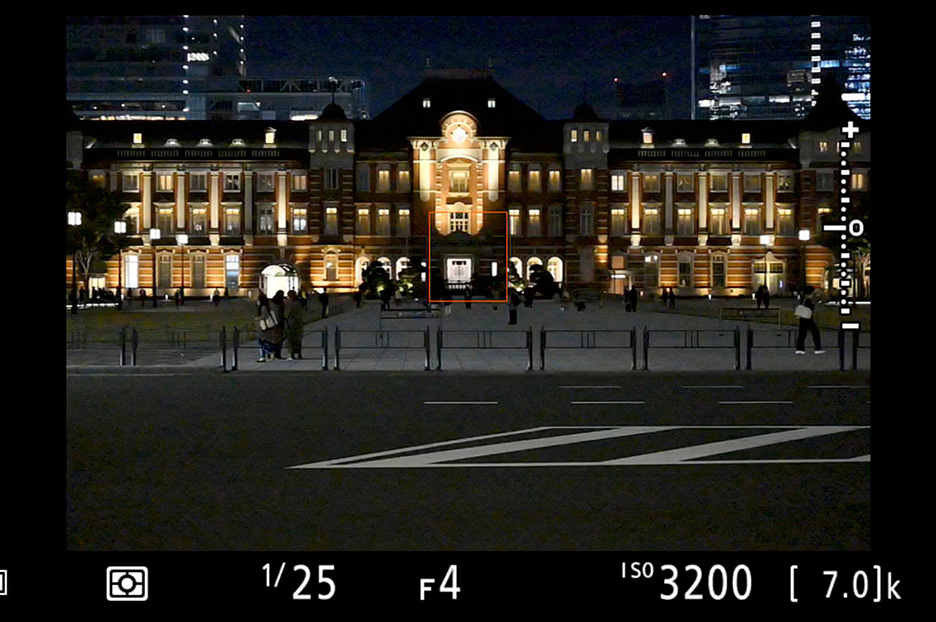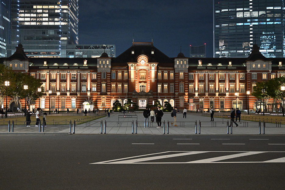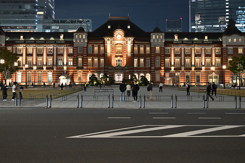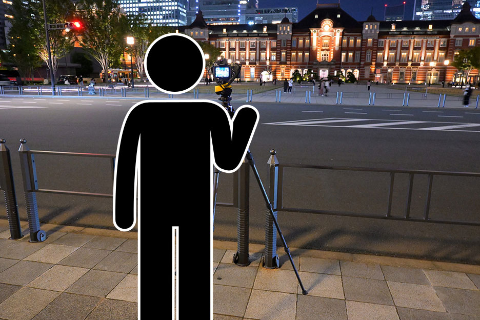 今回はライトアップされた東京駅、丸の内駅舎を撮影します。三脚が立てられ、かつ通行の妨げにならない場所にカメラをセットしたら、構図を調整しましょう。