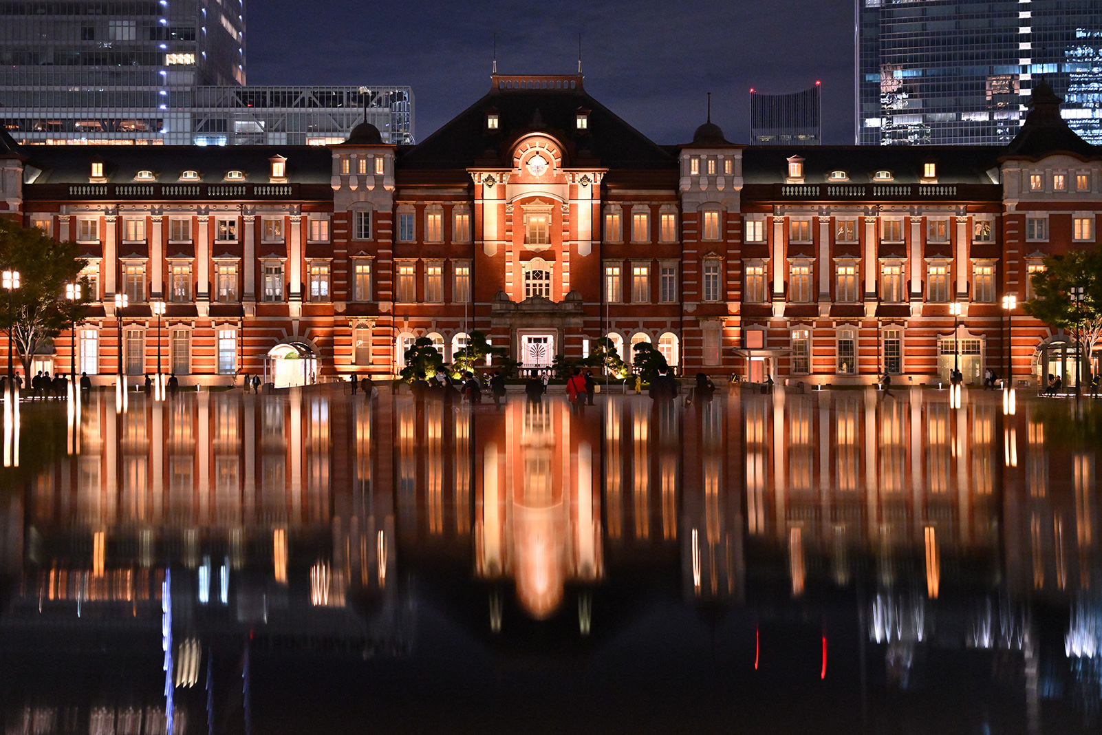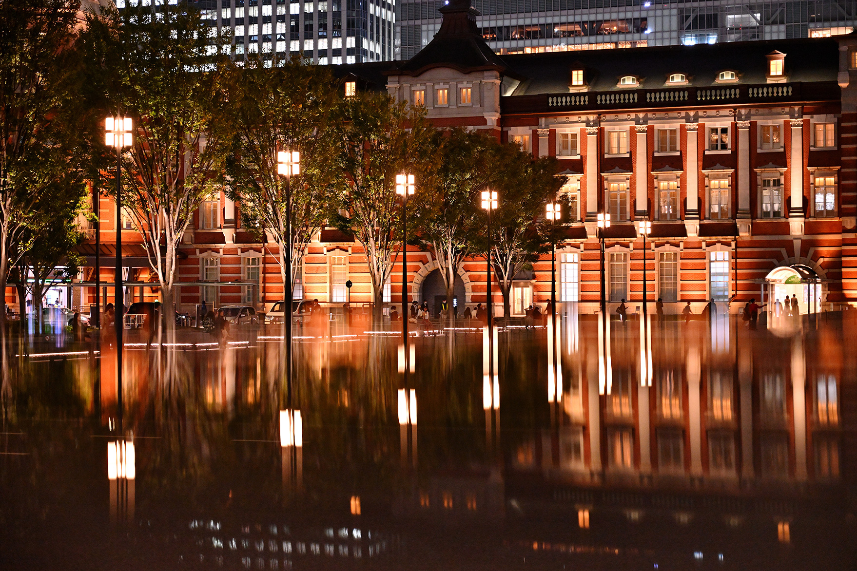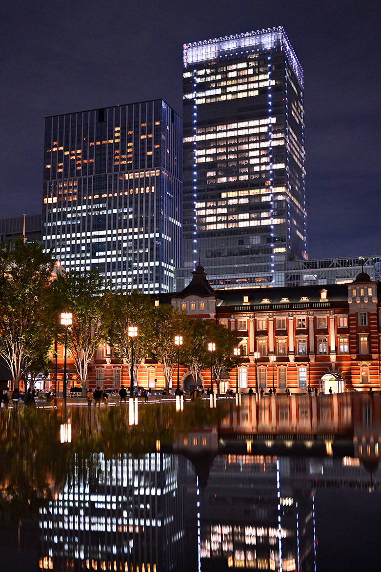 今回はライトアップされた東京駅、丸の内駅舎を撮影します。三脚が立てられ、かつ通行の妨げにならない場所にカメラをセットしたら、構図を調整しましょう。