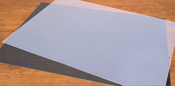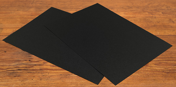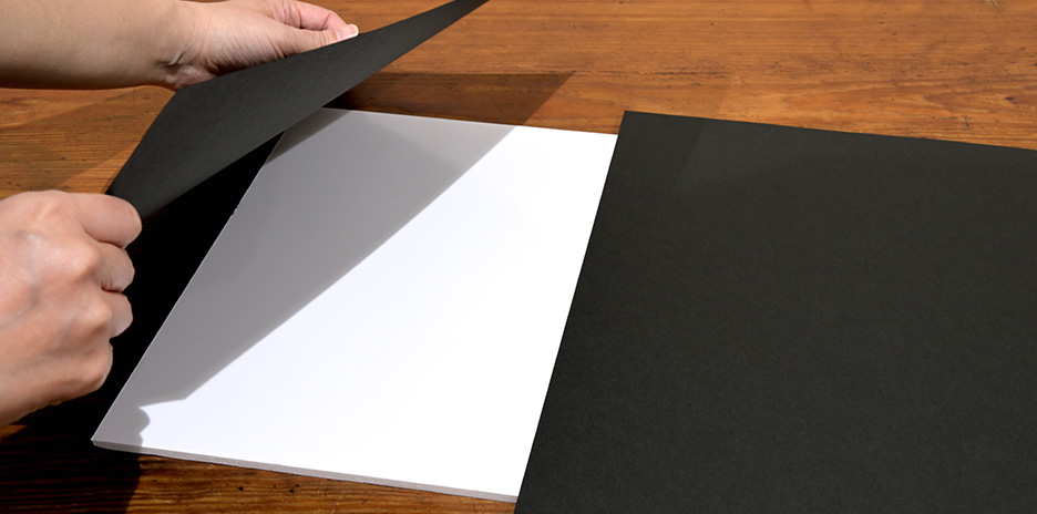 材料は4、5mm程度の厚さのしならないパネル板(ハレパネなど、片面に接着剤コーティングがされているものが便利です)、白、または黒色の光沢のあるPPシート(ポリプロピレン素材でできたシート)、黒画用紙です。サイズはそれぞれA4~A3程度のものを、黒画用紙はパネル板全体を覆うことができれば小さいものを貼り合わせてもOKです。