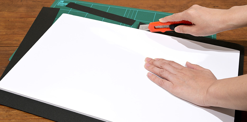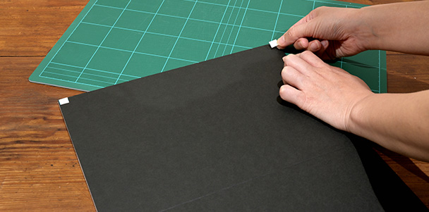パネル板の片面に、パネル板のサイズに合わせて黒画用紙を貼りつけます。大きい場合は、パネル板に合わせてカットします。