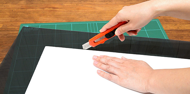 黒画用紙の四隅に両面テープを貼り、パネル板のサイズに合わせてPPシートを貼りつけます。大きい場合は、パネル板に合わせてカットすれば完成です。