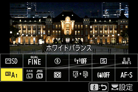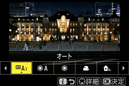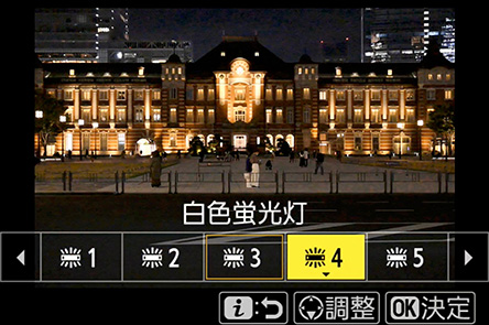 次に、仕上がりの色味を変えるホワイトバランスを調整します。選んだホワイトバランスによって光の色が変わり仕上がりイメージを変えることができます。どれを選ぶかは好みによりますが、今回は東京駅のレトロな雰囲気を活かして赤みを加える[白色蛍光灯]を選びました。