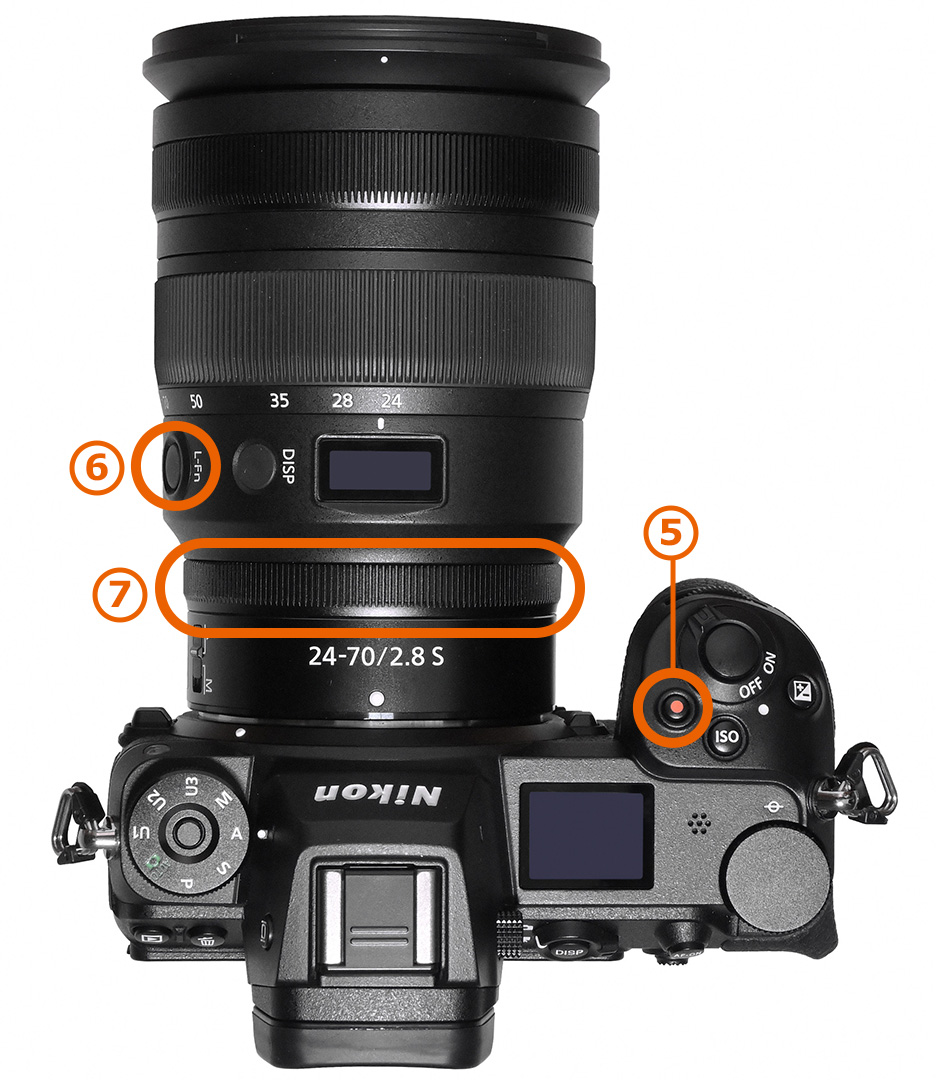 ⑤動画撮影ボタン ⑥レンズのFnボタン