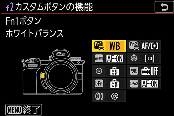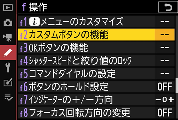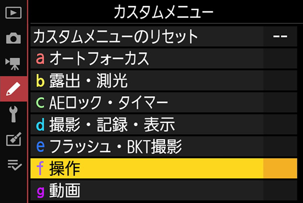 メニュー画面から[カスタムメニュー]→[f操作]を選択してOKボタンを押します