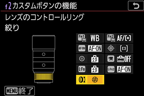 [f2カスタムボタンの機能]の画面から[レンズのコントロールリング]を選んでOKボタンを押します