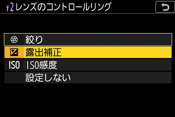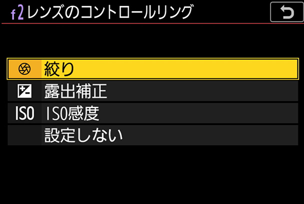 割り当てることができる設定の一覧が表示されます。[レンズのコントロールリング]には[絞り][露出補正][ISO感度]を割り当てることができます
