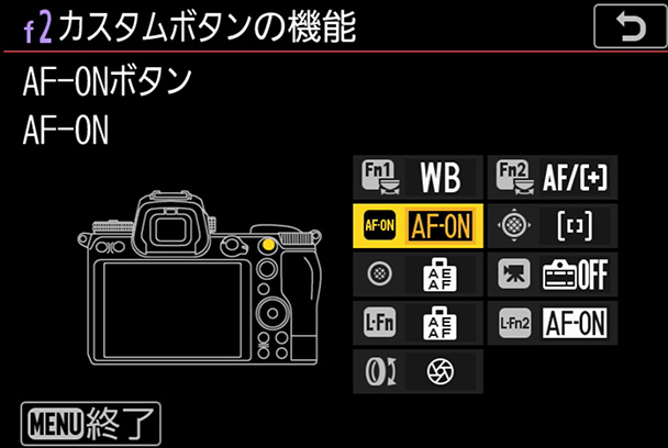 [f2カスタムボタンの機能]→[AF-ON]ボタンを選んでOKボタンを押します