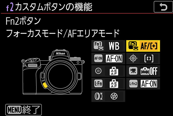 初期設定では[Fn2]ボタンに[AFエリアモード][フォーカスモード]の切り替えが設定されています