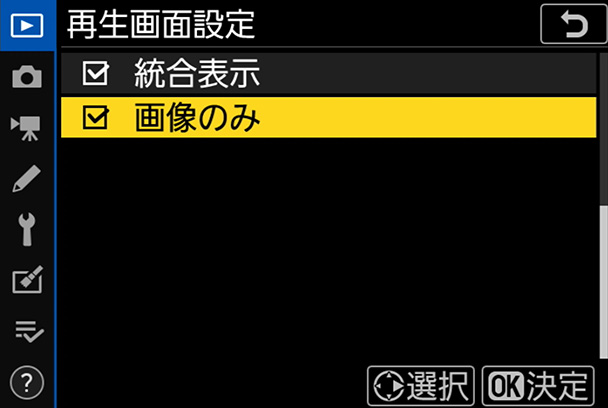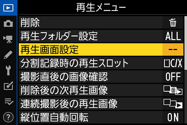 MENUボタンから、[メニュー画面]→[再生メニュー]→[再生画面設定]を選択してOKボタンを押します