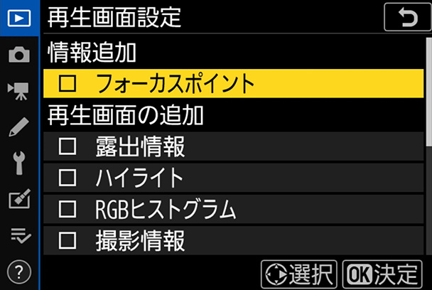 再生画面設定では、画像を表示させたときにどんな情報を表示させたいのかを選ぶことができます