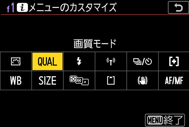 メニューのカスタマイズ画面から、設定変更したいアイコンを選びます。ここでは[画質モード]に設定されているアイコンを選んでみましょう