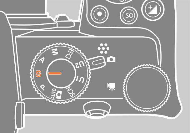 [撮影モードダイヤル]を[S]に合わせ(カメラの機種によっては、中心のダイヤルロックボタンを押しながらダイヤルを回します)、[シャッター優先オート]に設定します