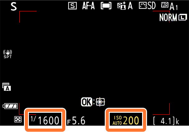 印の部分が、「1/1600」、「ISO AUTO」と表示されていればOKです