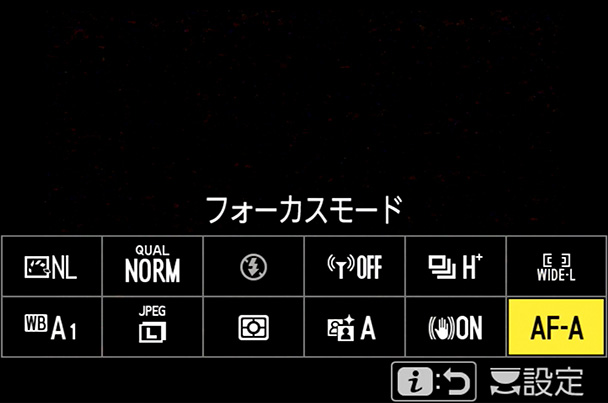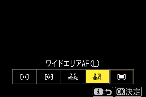 - 「AFエリアモード」は「ワイドエリアAF(L)」に、「フォーカスモード」は「AF-C」に設定する。