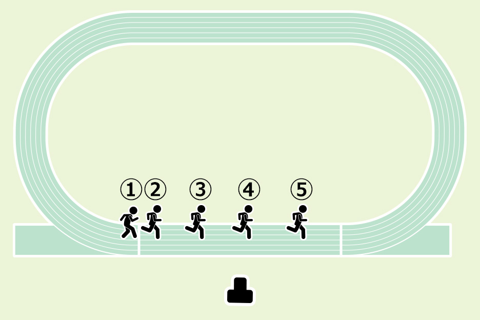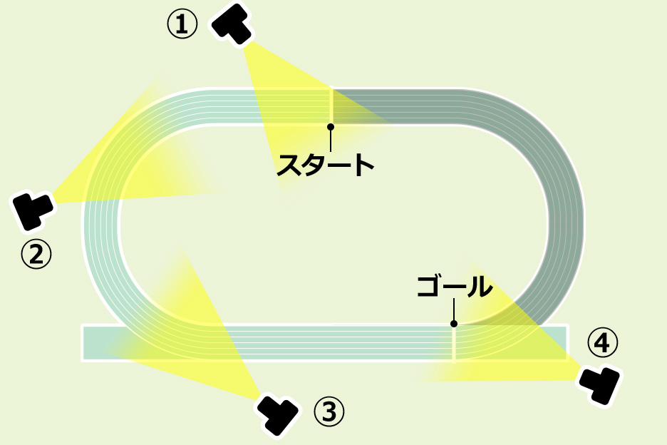 スタートからゴールまで直線で走るコースを横から撮影する場合を例に、撮りかたの基本とシャッターチャンスのポイントを説明します。