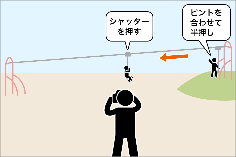 ターザンロープは、スタート位置から決まったコースを安定した速度で移動します。スタート位置についた子どもにピントを合わせて半押し(ピントをロック)し、移動する子どもをカメラで追います。ターザンロープは最後の方になるにつれ速度が落ちていきますので、撮影者はトップスピードに乗って速度が安定している前半から真ん中あたりに立ち、子どもが横に来たタイミングでシャッターを切ります。