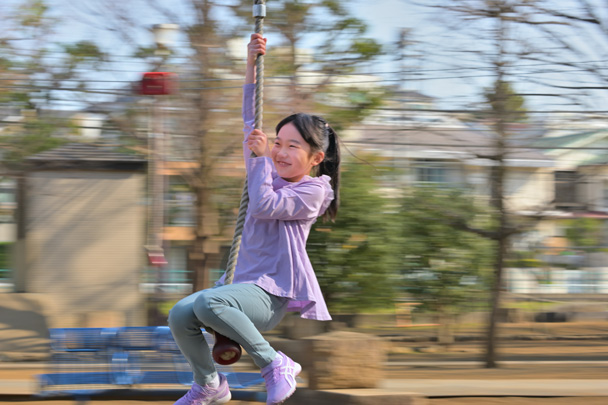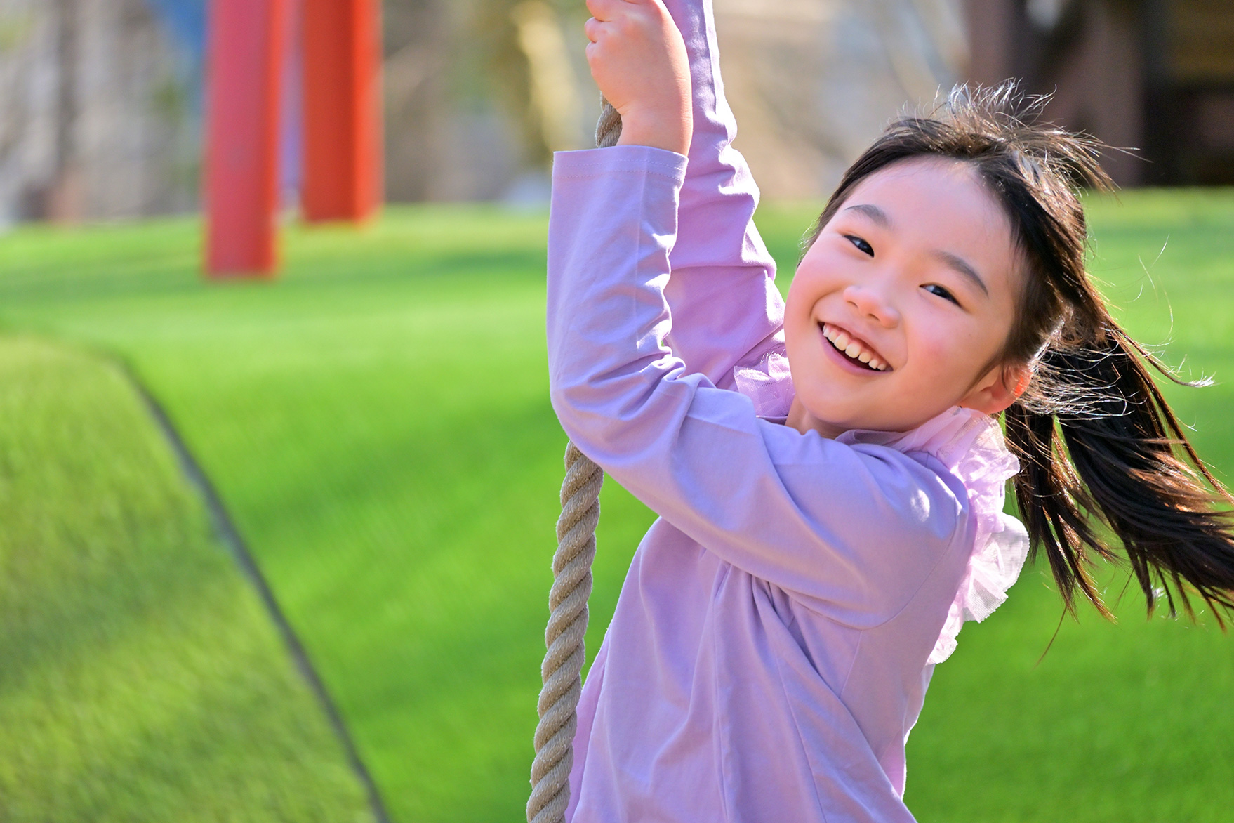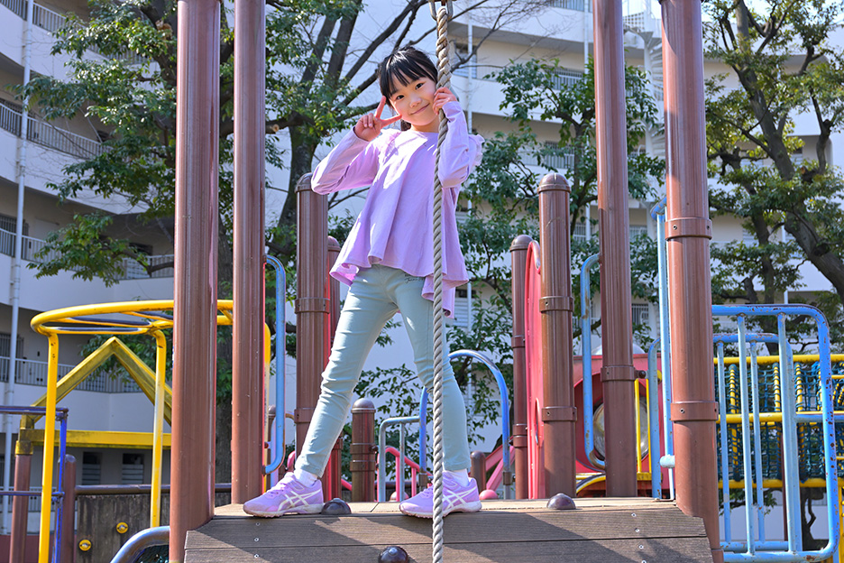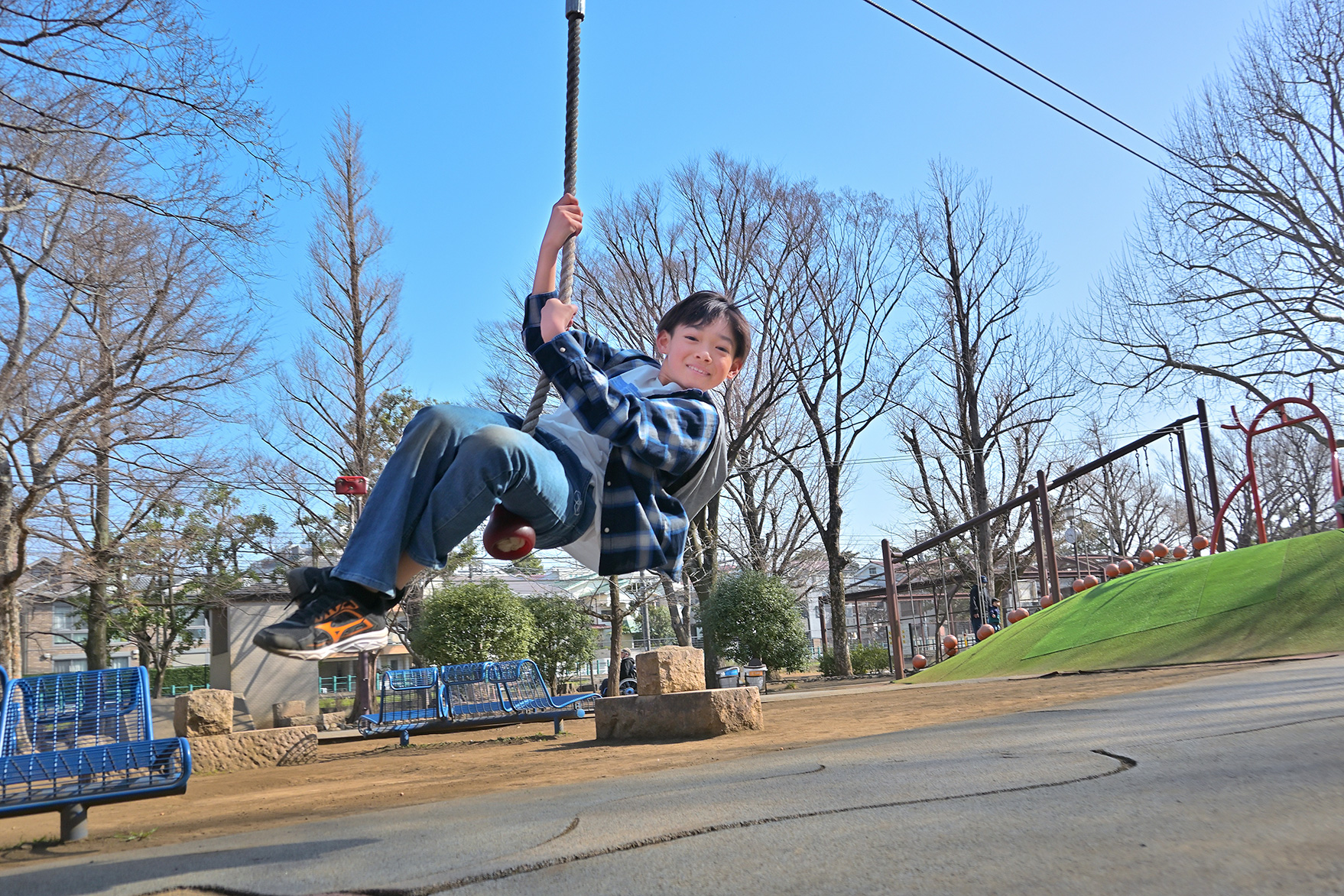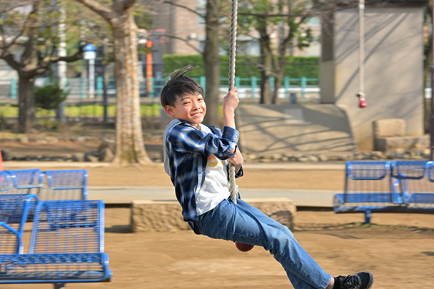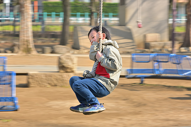撮影の難易度は少々高めですが、成功すれば臨場感あふれる写真になります。流し撮りがしやすい被写体として今回は、公園にある遊具「ターザンロープ」で遊ぶ子どもをテーマに撮影してみましょう。
