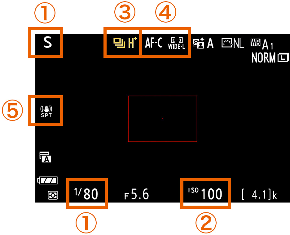 ➀ 「撮影モード」を「シャッター優先オート」にし、シャッタースピードを遅く設定する(今回は1/80秒)。