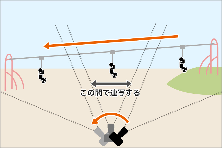 ターザンロープに乗る子どもの動きとシンクロするようにカメラを左右に振り、子どもが近づいて来たタイミングでシャッターを切り連写で撮影します。撮りかたのポイントは以下の3つです。