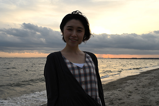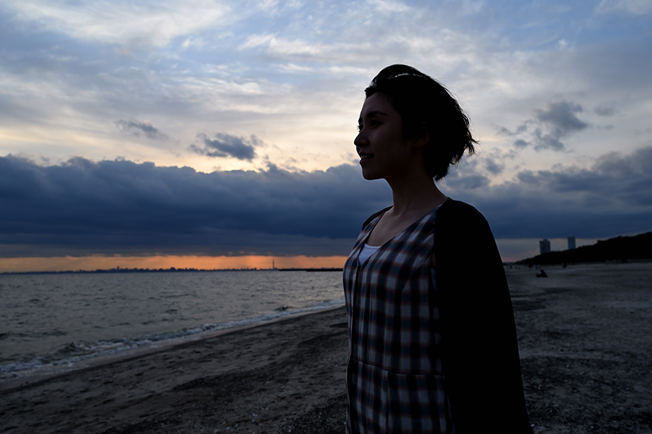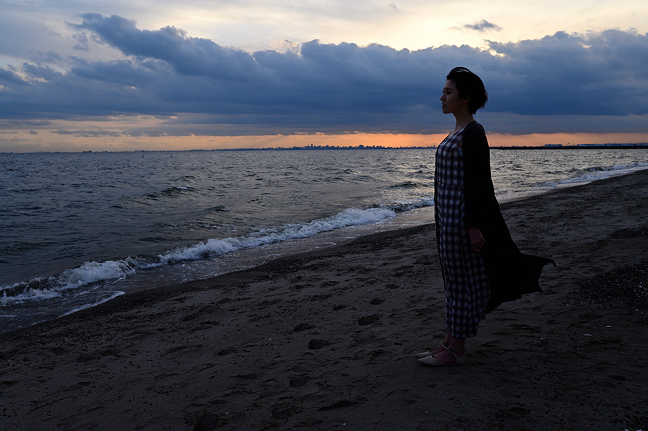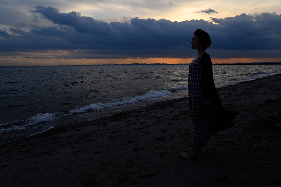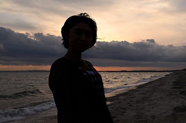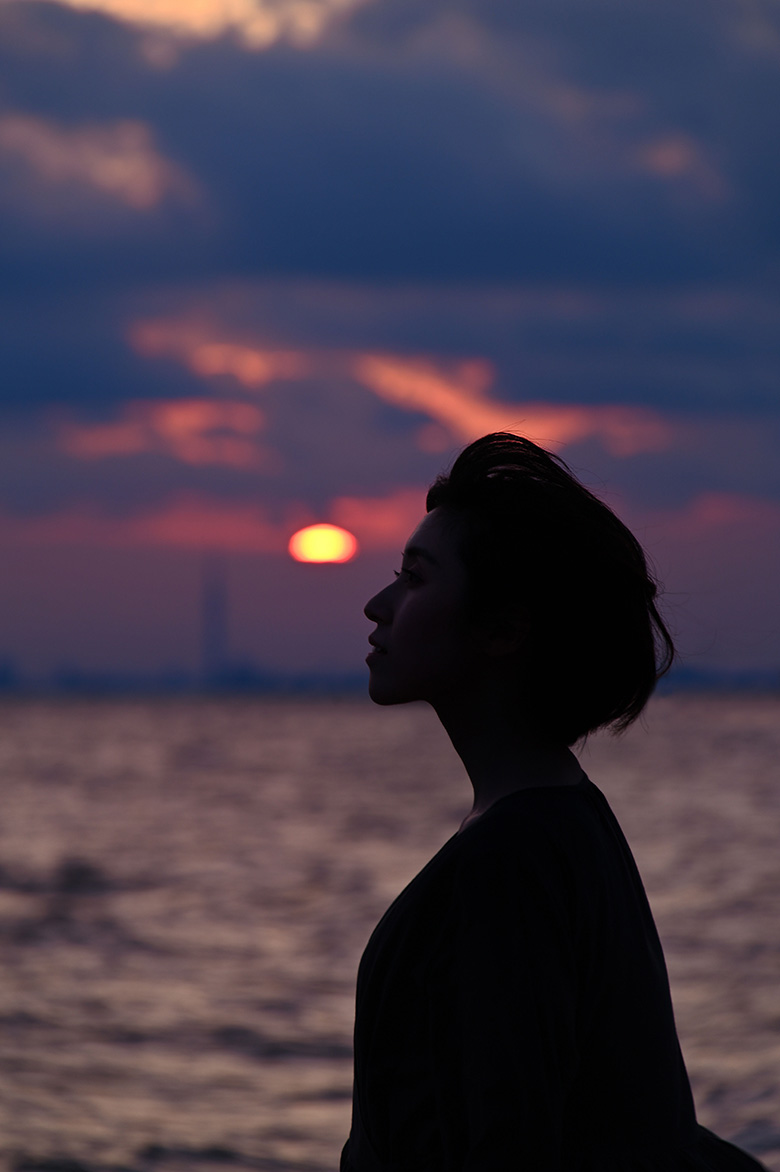 海岸に近づいて立ってもらい、全身のシルエットが分かるように少し引いて撮影