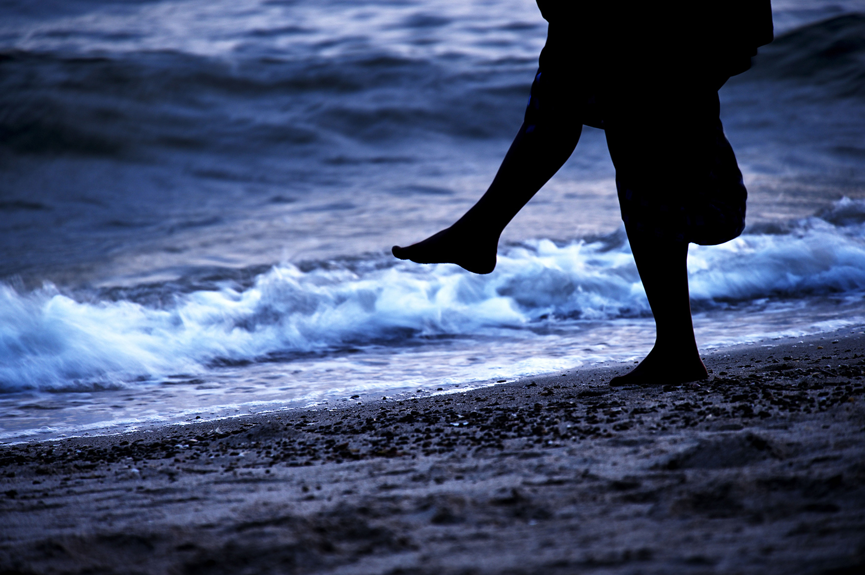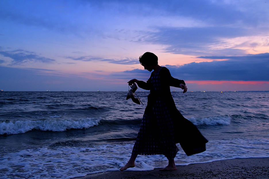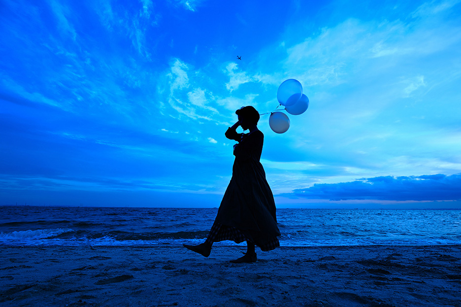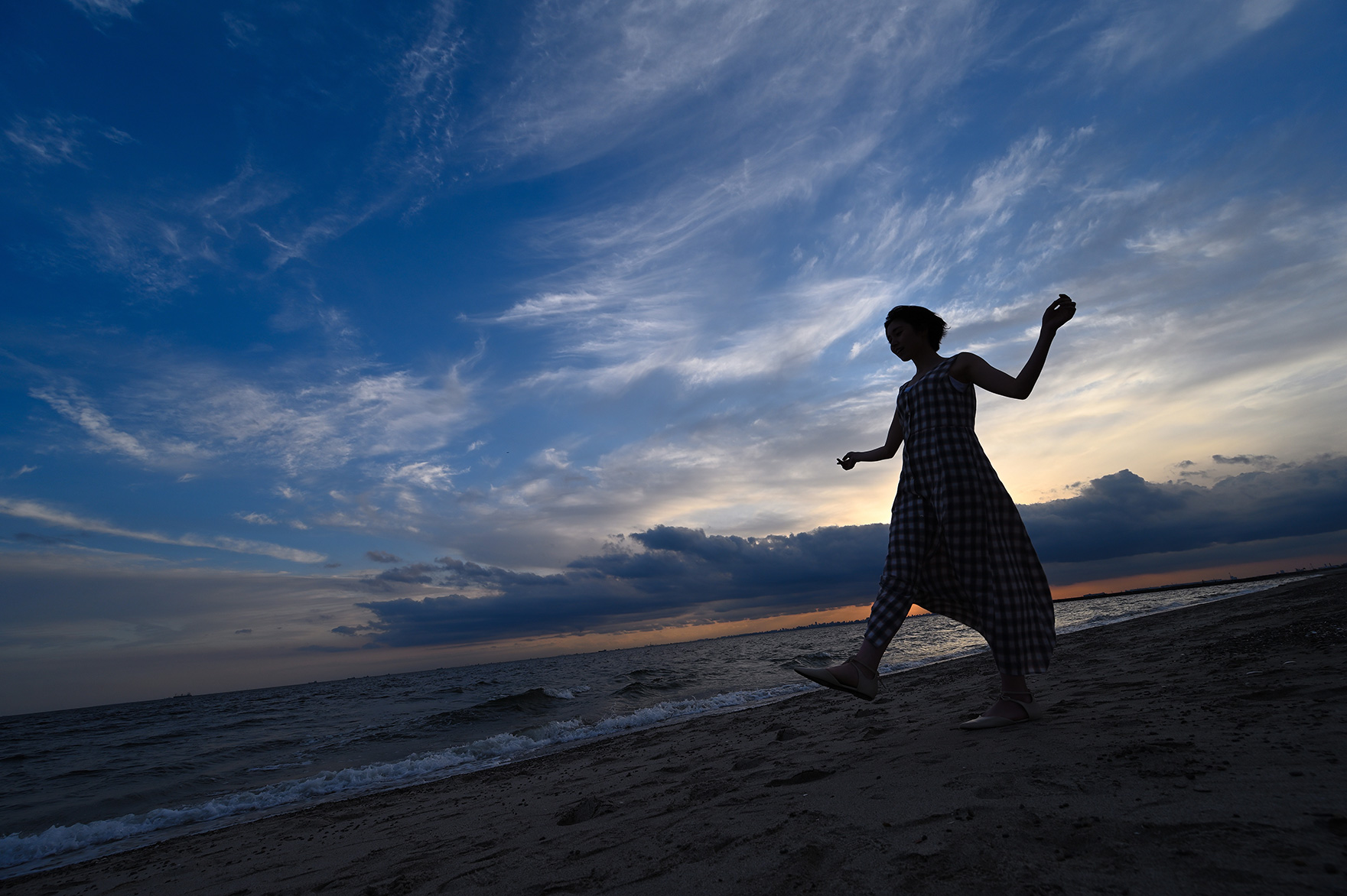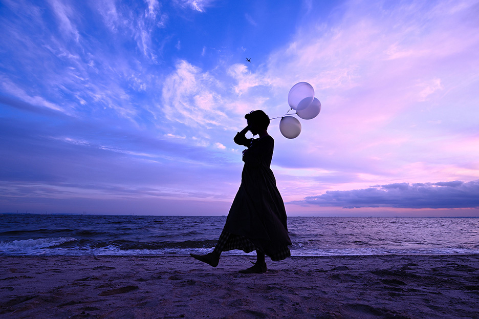 - アングルを少し下げ、また波打ち際ギリギリを歩いてもらうことで背景を海と空だけにしてシルエットを際立たせる