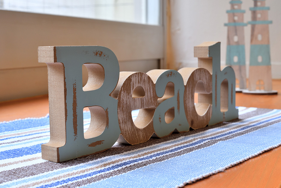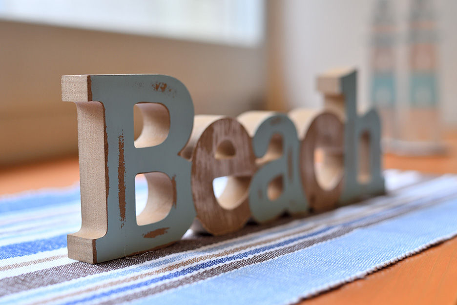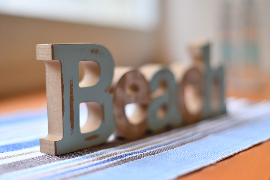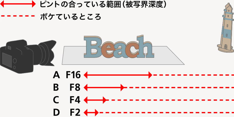 これは「Beach」というアルファベットの置物と灯台の置物を同じレンズで同じ位置から撮影した写真です。4枚の写真を比べるとAは奥の方まで見えていますが、B、C、Dになるにつれ奥の方からだんだんとボケていくのが分かります。レンズも撮影位置も同じなのになぜボケ方が変わるのか、それは絞り値を変えているからです。