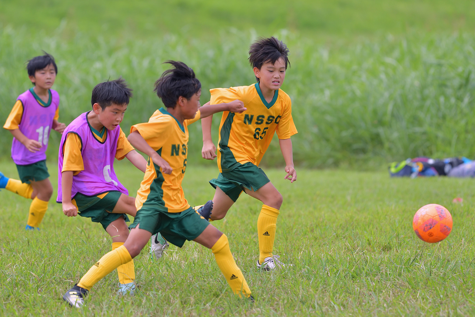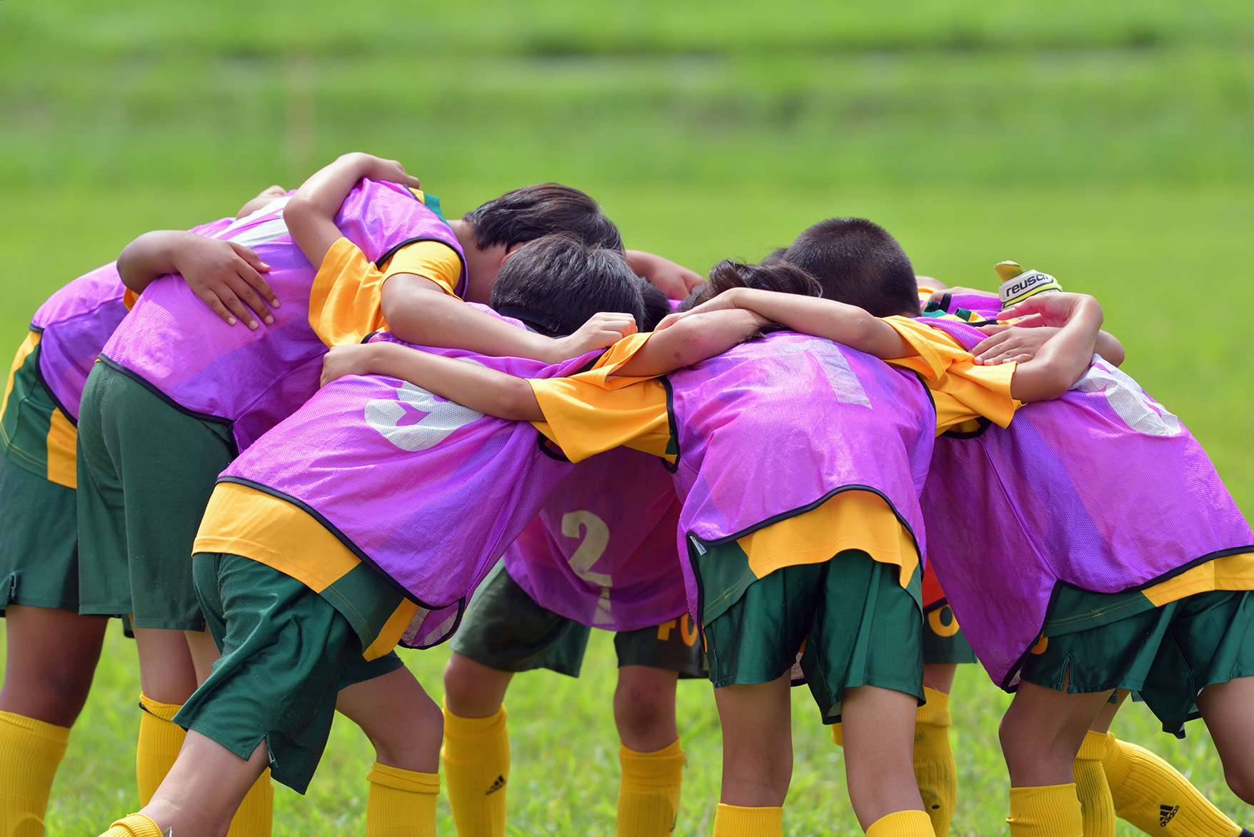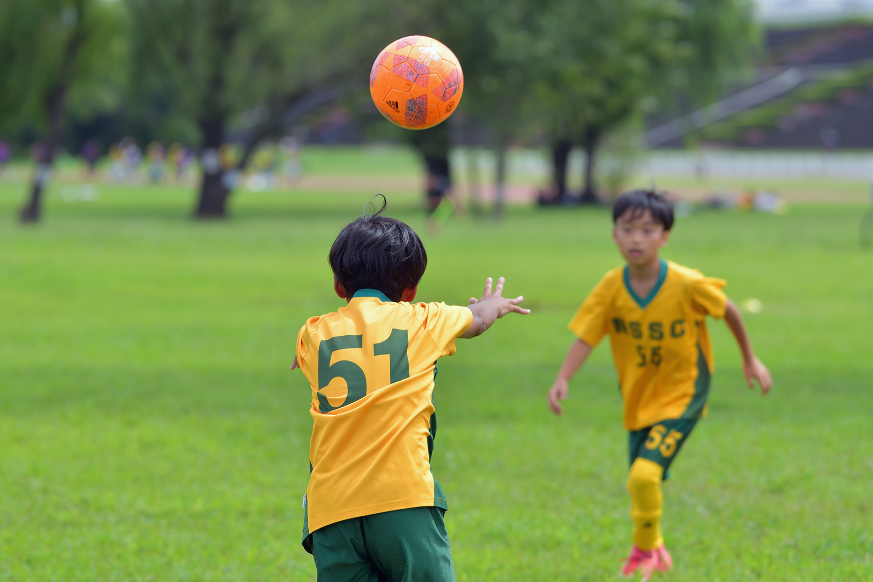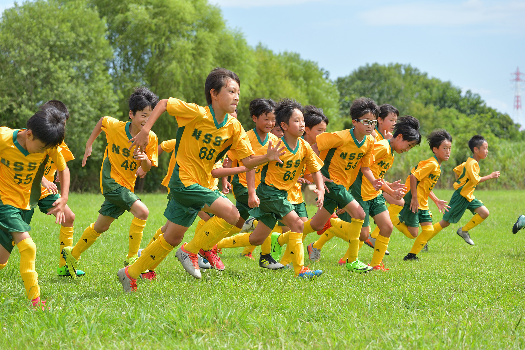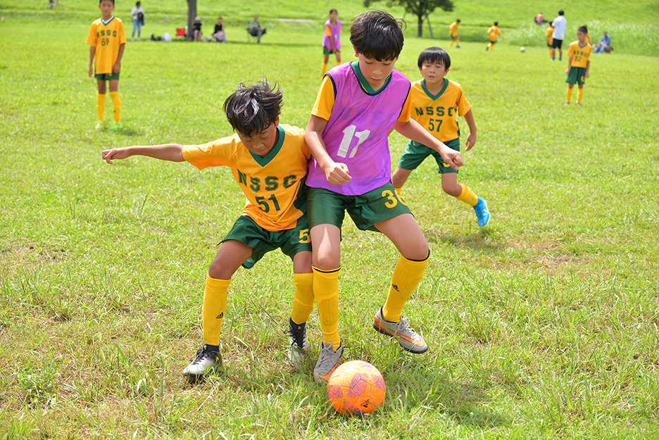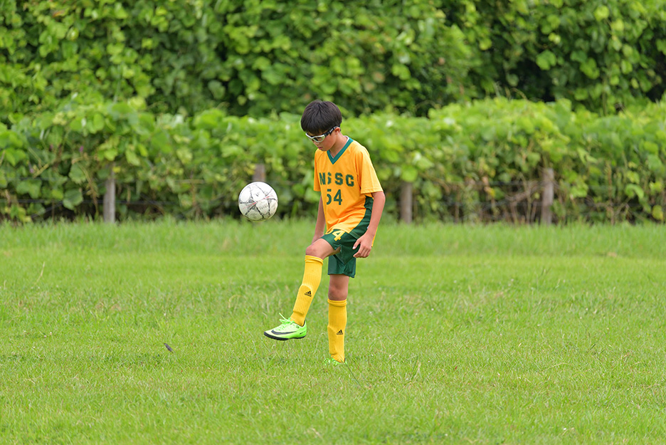 練習風景や試合の流れなど、選手たちの動きを広く見渡すことができるフィールドのサイド側から撮影することにしました。選手の邪魔にならないよう5mほど離れた場所から、青々とした芝生を背景にプレイする姿を狙います。