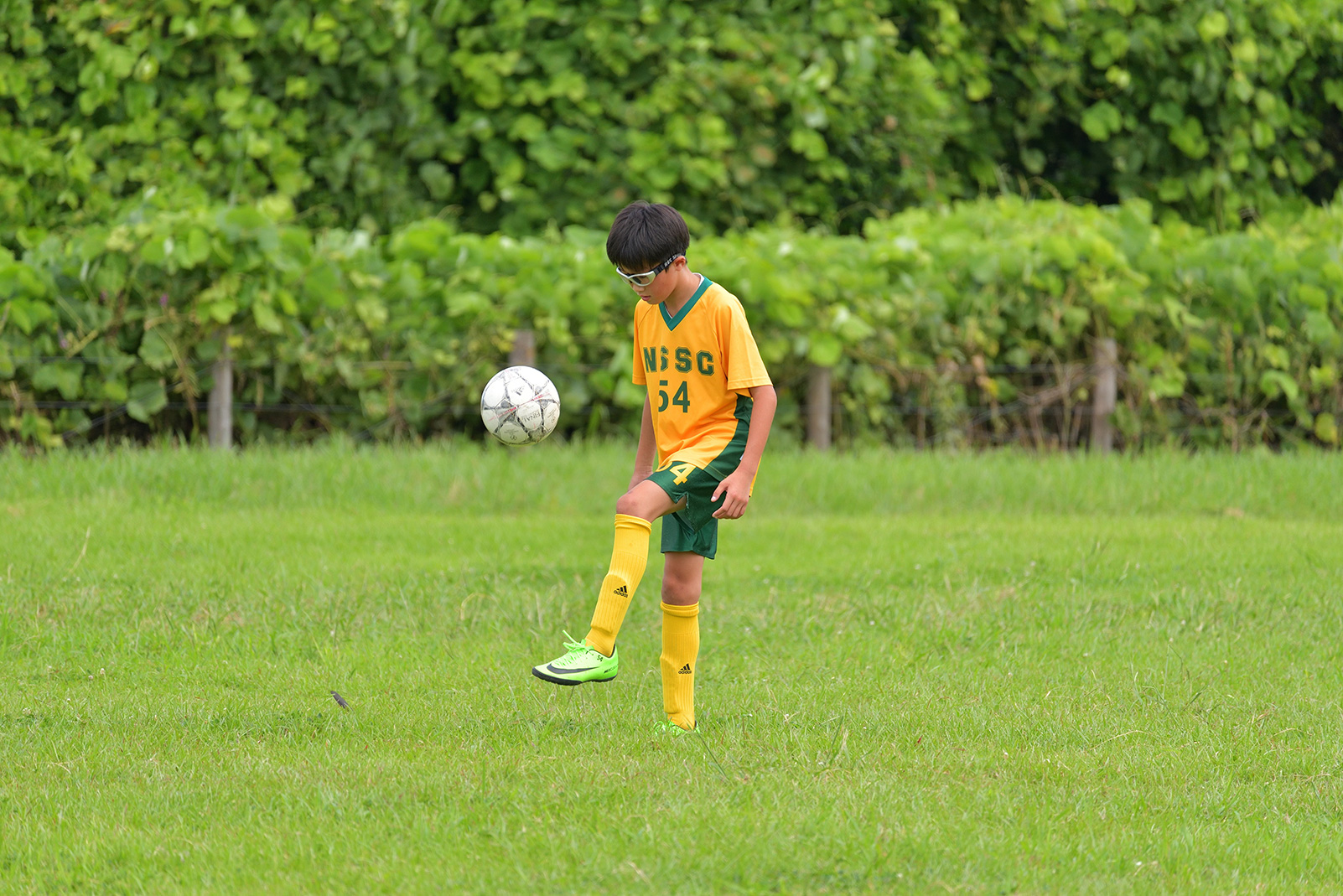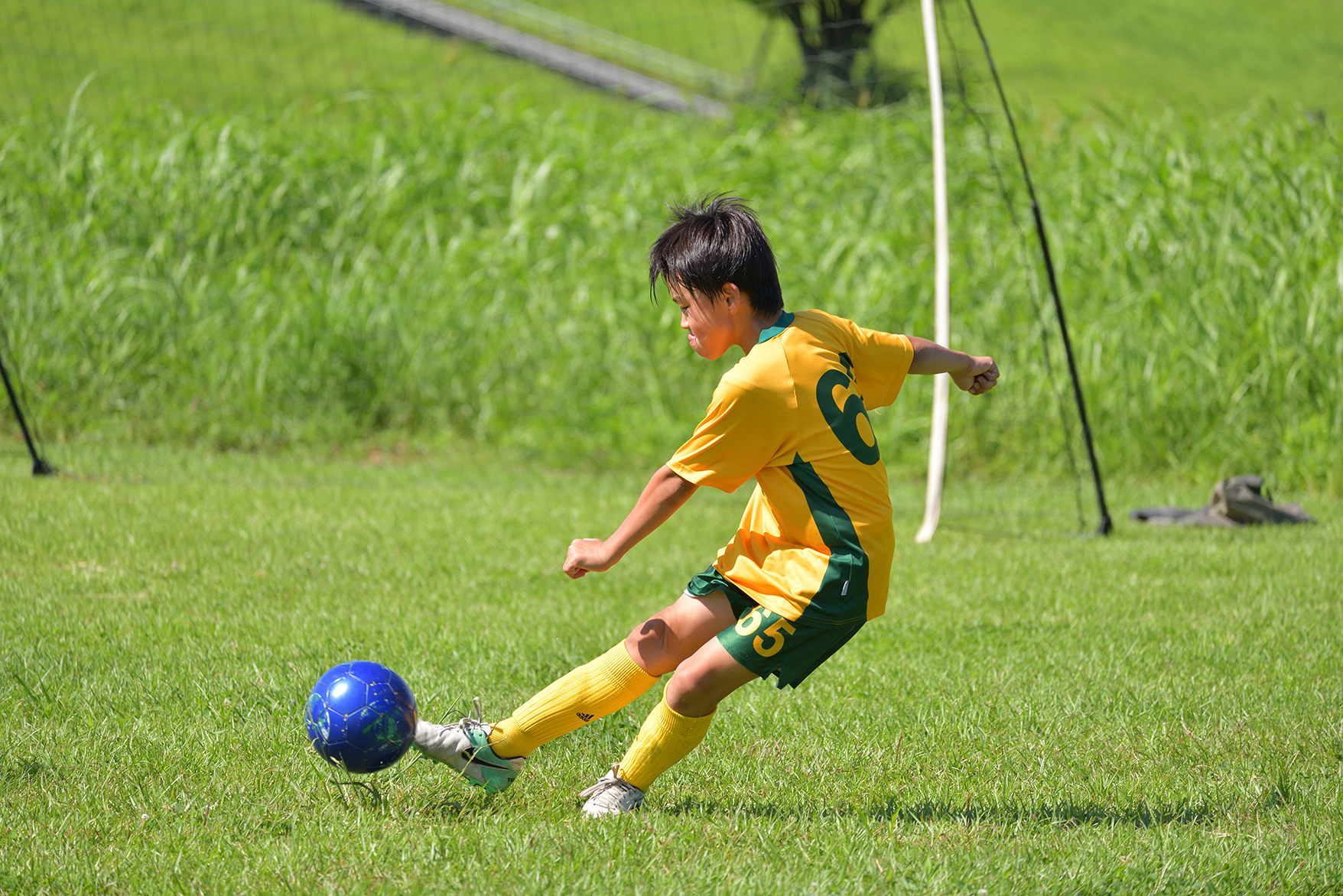 フィールドのちょうど中央部でシュート練習する選手を顔が見える位置から狙います。焦点距離220mmで被写体を大きく捉え、動きを予測しながら大きく足を振りあげた瞬間を撮影しました。シュートシーンはサッカーボールも構図内にバランス良く入れてフレーミングするとよいでしょう。
