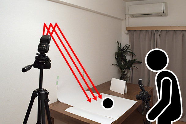 部屋には窓がありますが、撮影中に日が落ちて光量が変化すると明るさやホワイトバランスなどの調整が大変になりますので、カーテンで外光を遮断しスピードライトを壁にバウンスさせ撮影を行うことにしました。時間によって変化する外光の影響を受けにくく夜の時間帯や窓のない部屋でもイメージ通りの撮影ができるスピードライトはとても便利です。またテーブルフォト撮影時は影になってしまう部分を明るく調整できるレフ版を用意しておくとよいでしょう。今回は白いスチレンボード2枚をつなぎ合わせたものをレフ版として利用します。なお手ブレを防ぐために三脚を使い撮影を行います。