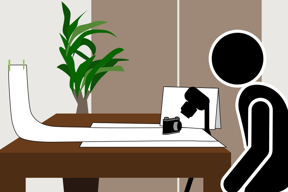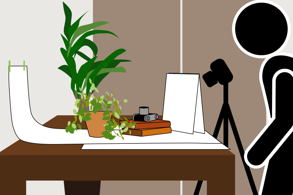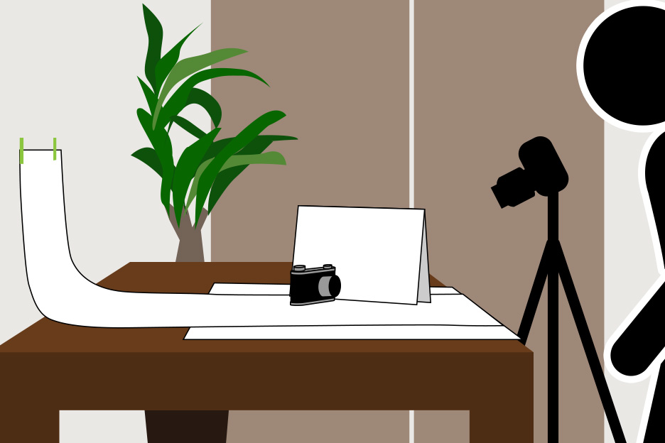 今回撮影に選んだ小物は、年代もののニコンS型です。撮影準備としてまずテーブルを壁につけ、大きめの白い紙を敷きます。さらに背景が整理できるよう壁にも紙を貼りつけておきましょう。カメラのディテールや状態を伝える写真はこの上で撮影し、また雰囲気あるイメージ写真はこの紙の上に布や本などをセッティングして撮影します。