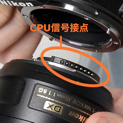ニッコールレンズのうちCPUを内蔵しているレンズを「CPUレンズ」と呼びます。CPUレンズにはカメラに装着する部分(レンズマウント)に信号接点があります。