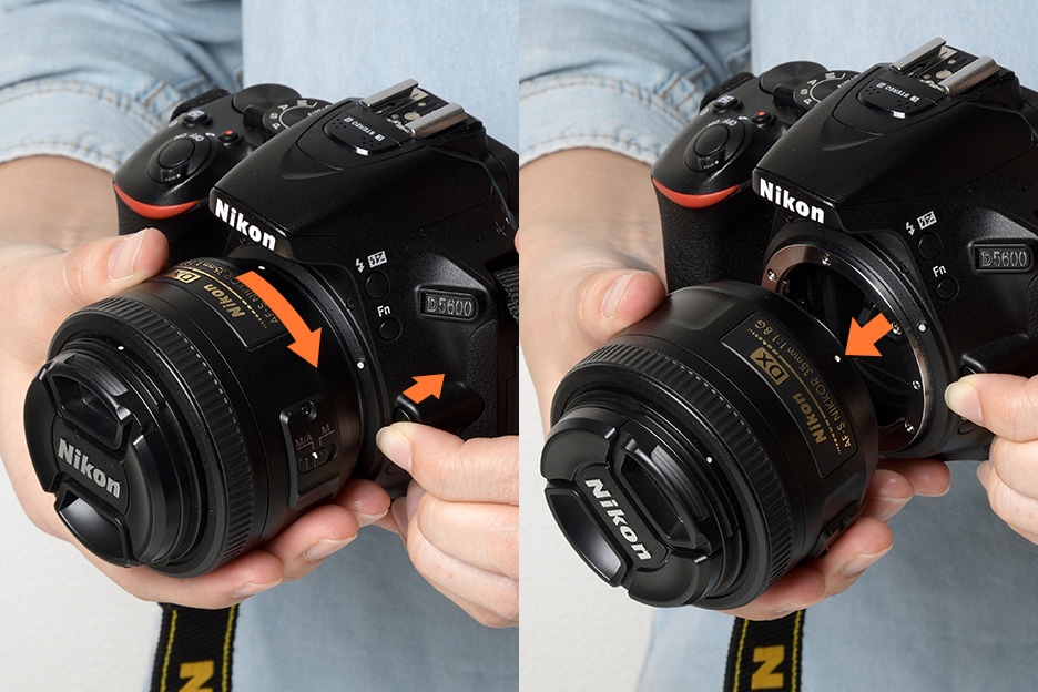 カメラの「レンズ取り外しボタン」を押しながら矢印の方向に回すことで、レンズを取り外すことができます。外したレンズには、すぐ裏ぶたをつけるようにしましょう。