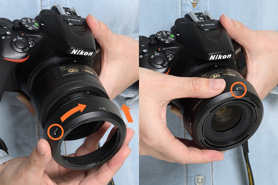 )」が合うまでフードを回し、カチッと音がしてしっかりフードが固定されたら装着完了です。