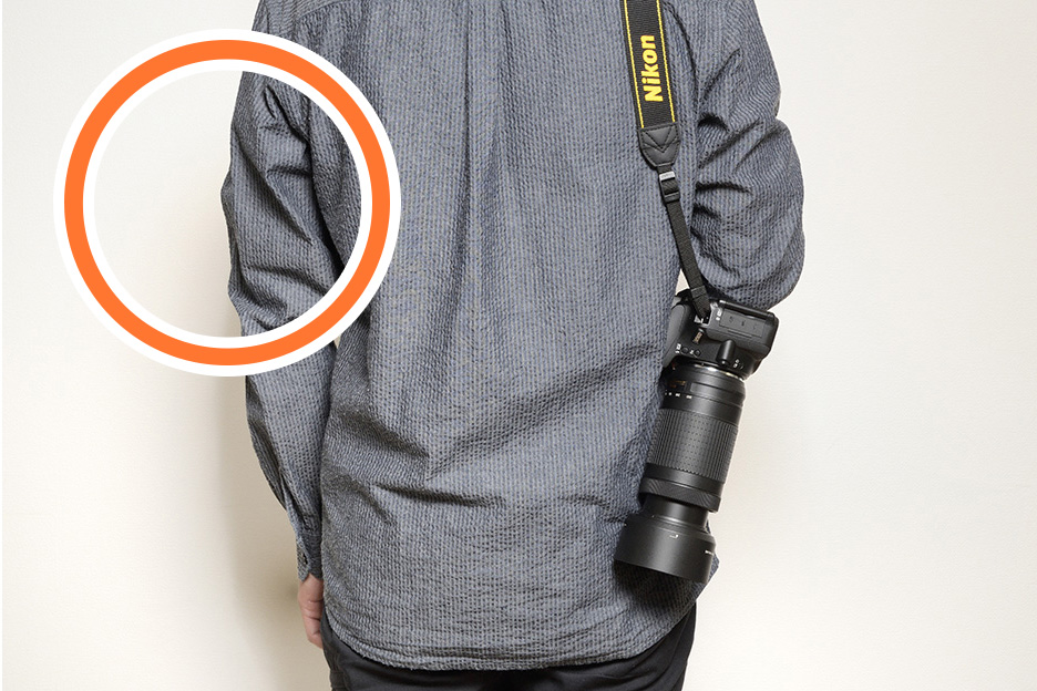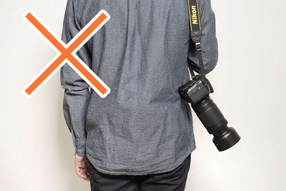 撮影中はカメラを落とさないよう、ストラップをしっかり首にかけて持ち歩きましょう。ストラップを肩にかけて持ち歩く場合は、カメラが外側を向いているとレンズが出っ張るため、どこかにぶつけてしまってはレンズにとっても周囲にとっても危険となります。カメラが身体の内側に向くようにかけましょう。