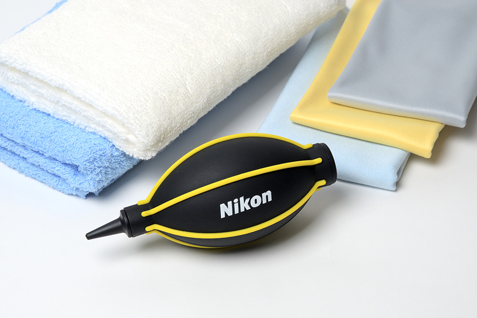 ブロアーは、先をレンズ面など汚れの気になる部分に向け、指で押しながら風圧で汚れをふきとばします。それでも落ちない場合は、タオルで軽くさっと払うように取り除きましょう。万が一タオル(クロス)に汚れなどがついたままでレンズをふくと傷がついてしまう場合があるので、注意が必要です。