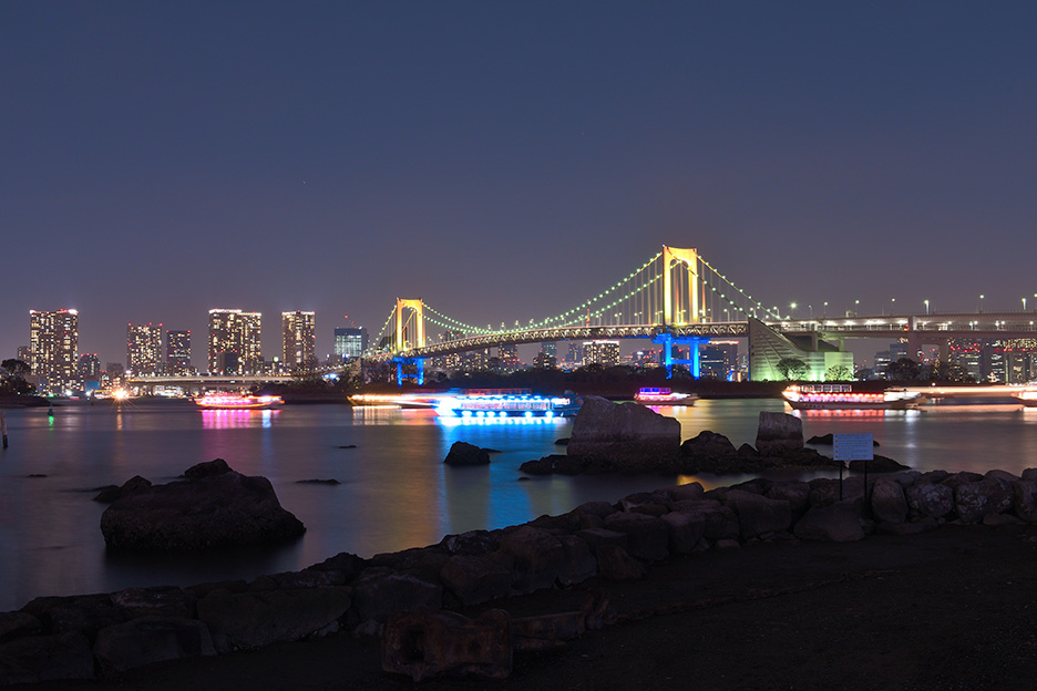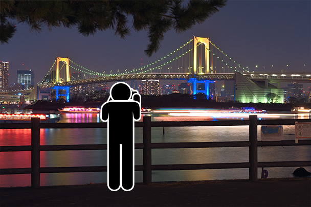 撮影場所に選んだのは海岸から海上に上がる花火を楽しむことができる場所で、周囲に広がる夜景を活かしながらの撮影も可能です。あらかじめ花火が打ち上がる場所を調べ、花火の背景にちょうどライトアップされた橋が入る位置を探して撮影場所を確保しました。目の前に遮るものがなく、しっかりと花火を狙うことができるのもポイントです。ここから花火の打ち上げ場所まではおおよそ500mほど、距離を考慮しながら撮影しやすい焦点距離を持つズームレンズをセレクトしました。