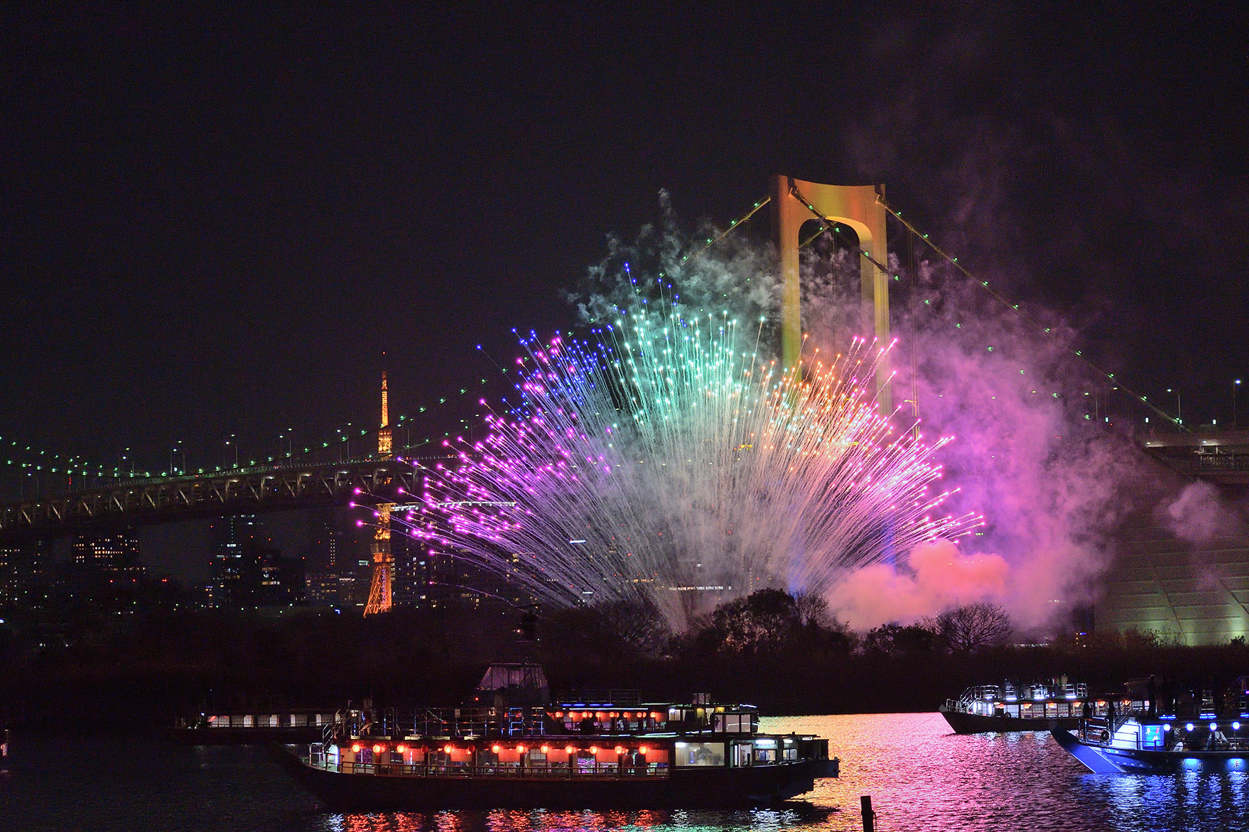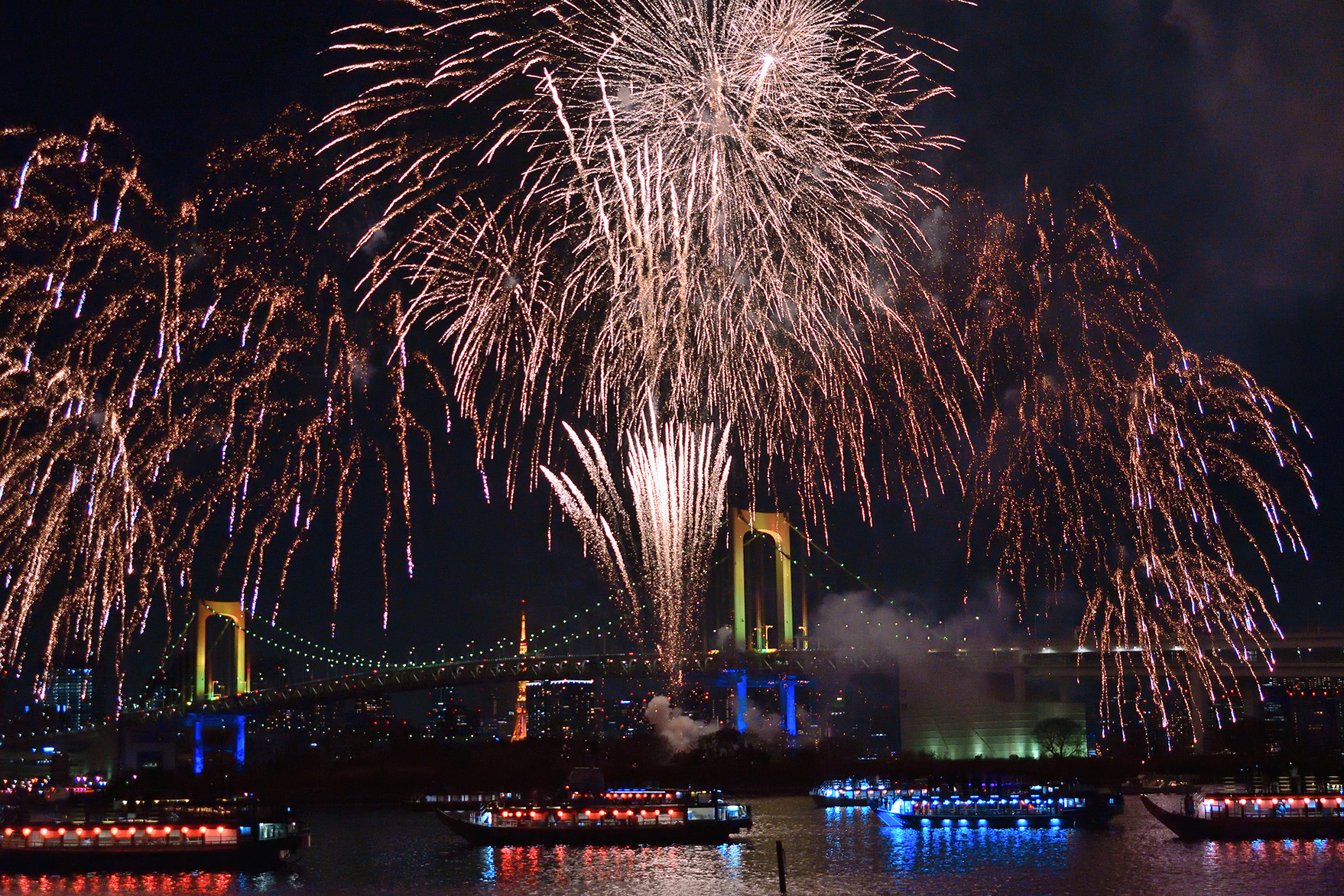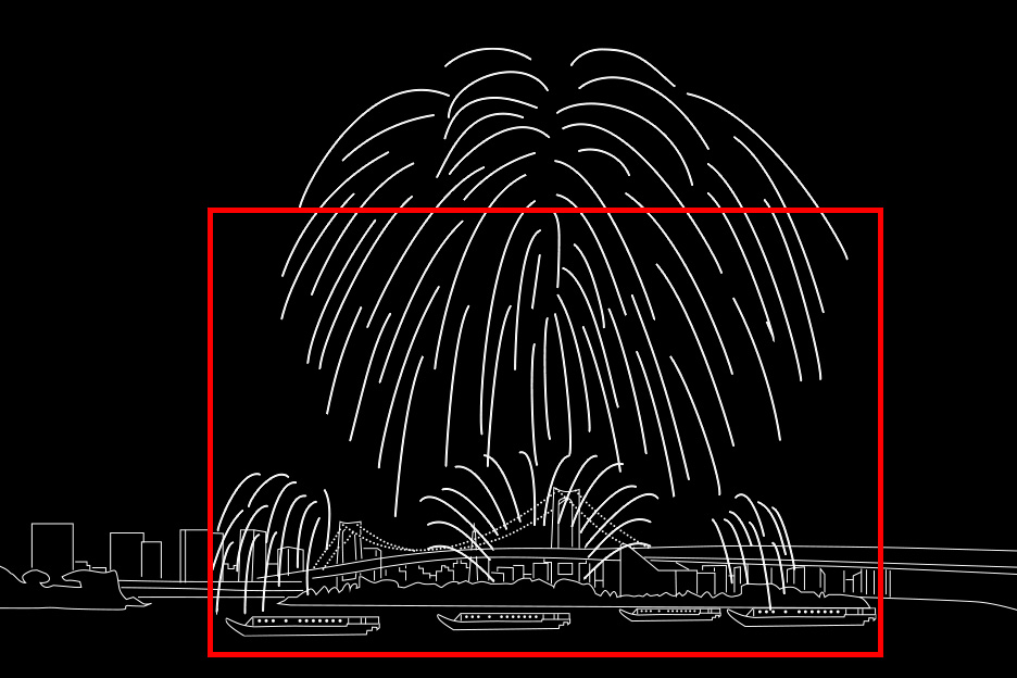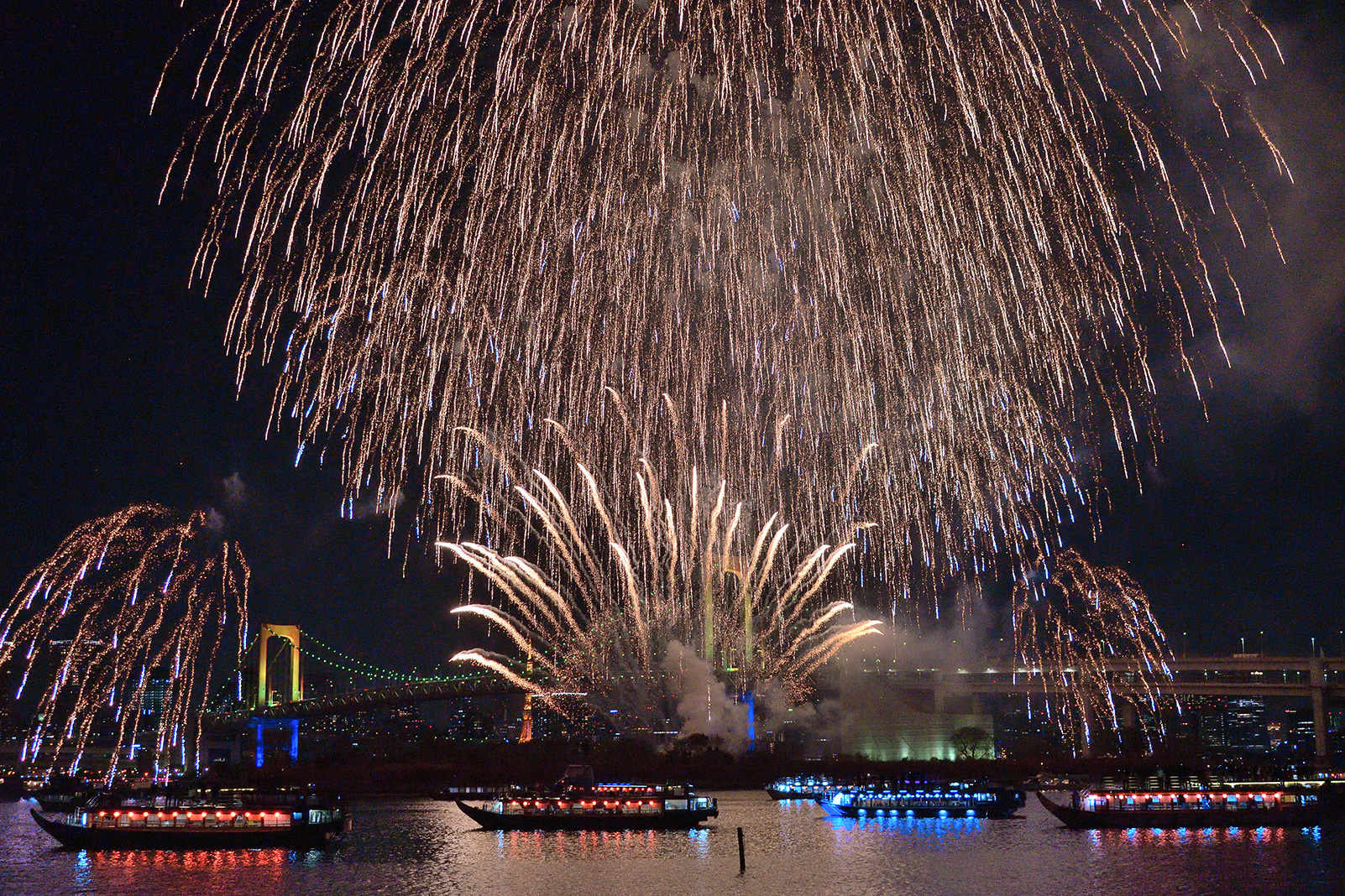 花火大会の終盤、数か所から連続で一斉に花火が打ち上がる大迫力のスターマインは夜空いっぱいに花火を入れるように焦点距離29mmで、その全景が伝わるようフレーミングし撮影しました。ライトアップされた橋と海上に並ぶ屋形船も一緒に撮影することで、とても華やかで豪華な印象の1枚になりました。