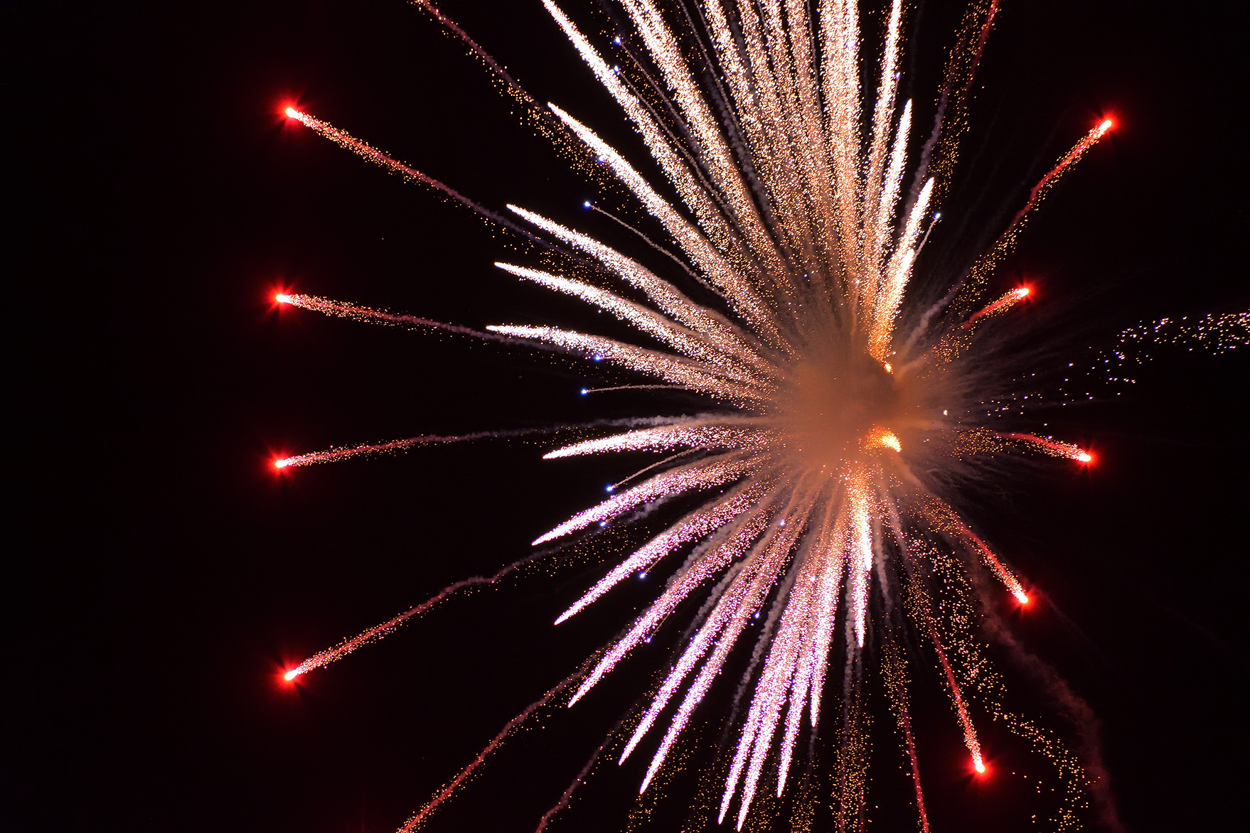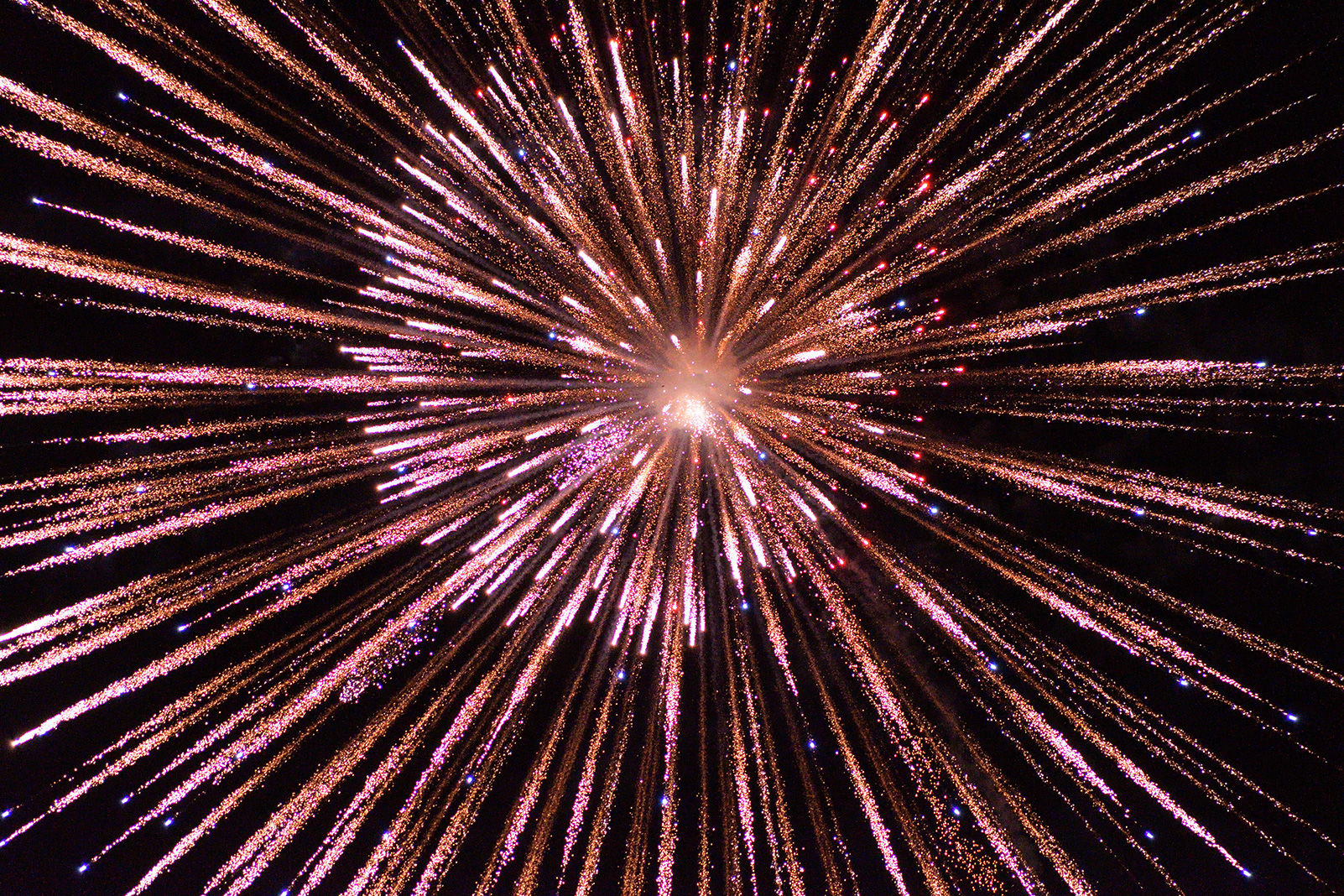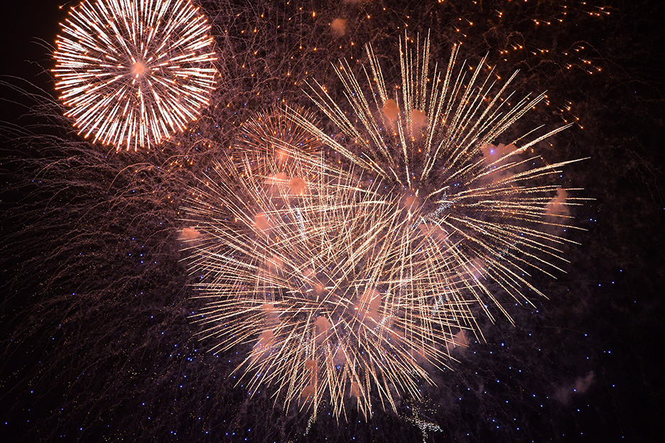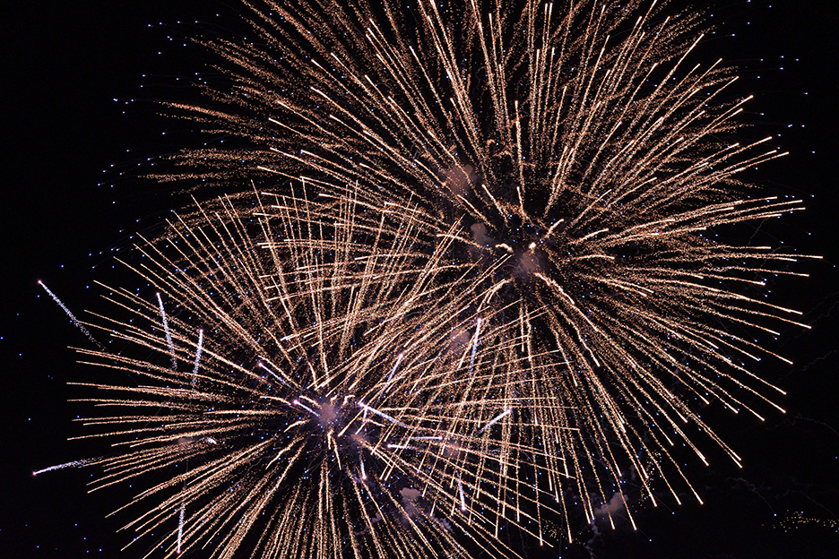 焦点距離300mmで花火の中心部分を大きく切り取って撮影しました。放物線状に勢いよく火花が飛んでいく一瞬の動きを迫力満点に捉えています。花火の中心部分を構図内にしっかり収めるために、花火玉が夜空に打ち上がっていくところから見失わないようレンズで追いかけ、花火が開くタイミングをしっかり狙って連写しています。